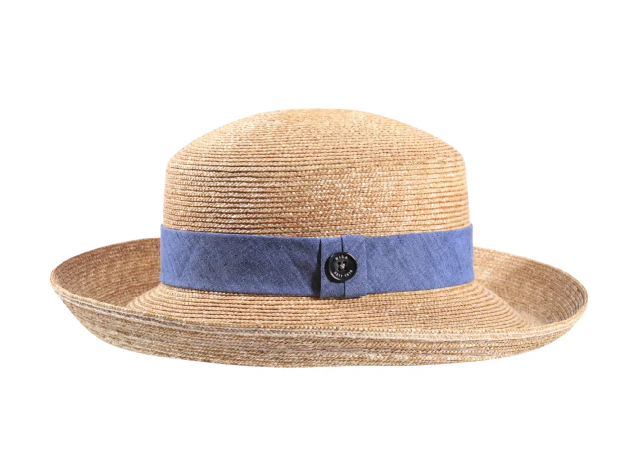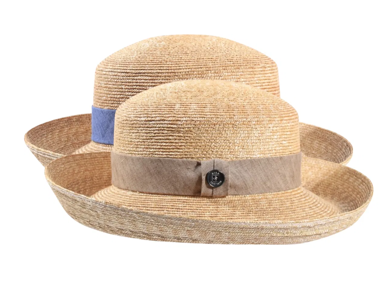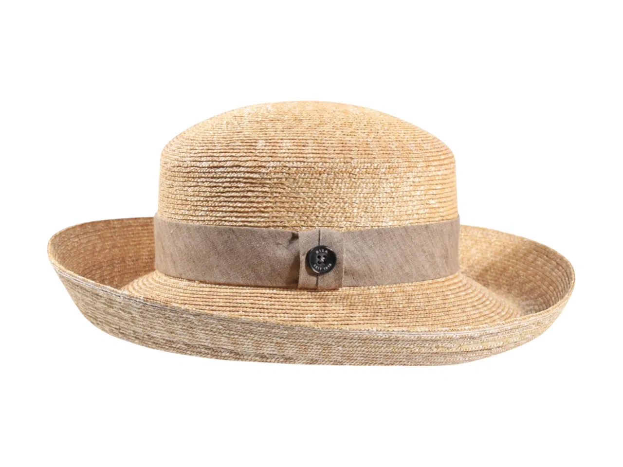 Mit seiner sanft abgerundeten Form und dem großzügigen Aufschlagrand verbindet dieser Strohhut klassische Huttradition mit sommerlicher Leichtigkeit. Das handgeflochtene Weizenstroh ist besonders atmungsaktiv und sorgt für ein angenehmes Tragegefühl – selbst an den heißesten Tagen. Die Garnitur aus Leinen – wahlweise in Ciel (Blau) oder Sand – wird durch den ikonischen Risa-Knopf auf der Traverse charmant vollendet. Das Modell besticht durch seine feminine Silhouette und die edle Natürlichkeit.