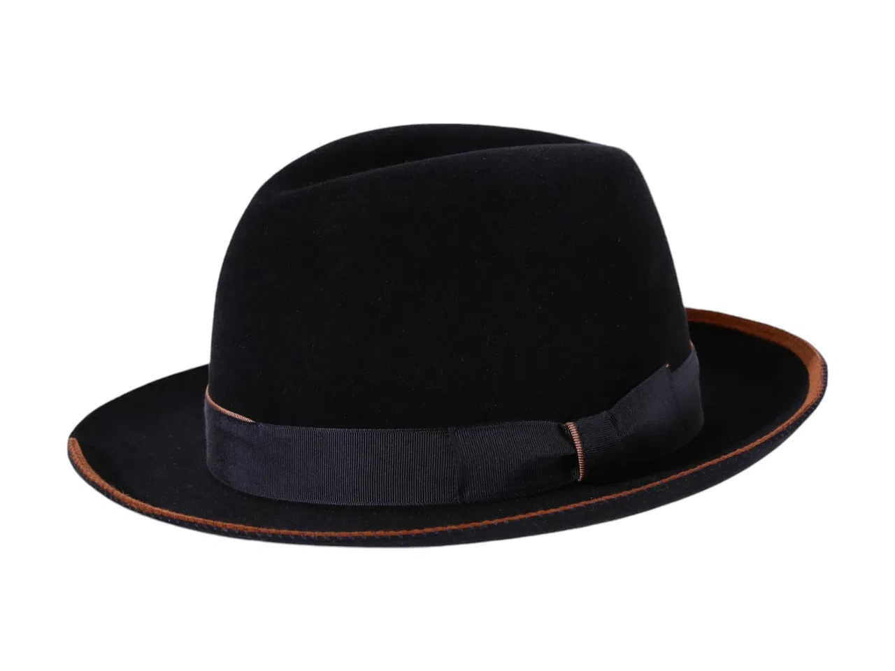Entdecken Sie den eleganten schwarzen Bogart mit einem orangen Filzeinsatz aus dem Schweizer Hutatelier! Dieser Haarfilzhut ist ein Meisterstück, bei dem jeder einzelne Teil perfekt aufeinander abgestimmt ist. Das hochwertige Hutband in einem passenden marineblauen Farbton mit einem Passepoil verbindet die Hutkrone äußerst elegant mit der edlen Krempe. Ein farblich fein abgestimmter Filzeinsatz in Orange auf der Hutkrempe gibt diesem Hut eine interessante Note und verleiht ihm eine einzigartige Optik.