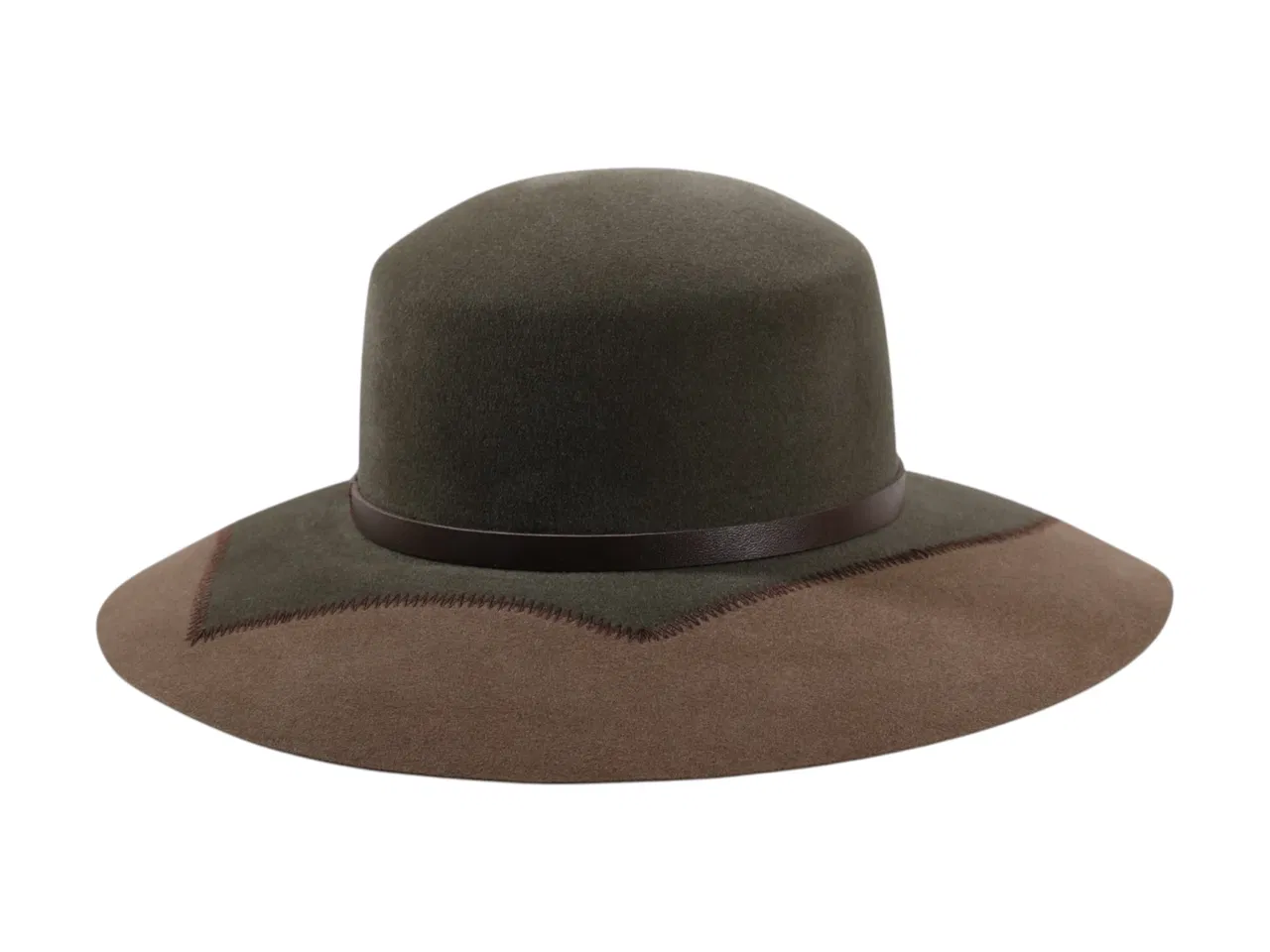 Die Cloche Velours „forest atmosphere“ vereint klassische Hutmode mit moderner Raffinesse. Gefertigt aus 100% feinstem Haarfilz Velours, zeigt dieses Modell eine faszinierende Farbkombination, die an Wald und Erde erinnert: wahlweise mit Kopfform in Moosgrün und Krempe in Schlamm oder umgekehrt. Das Ergebnis ist ein ausdrucksstarker Hut, der jedes Outfit stilvoll abrundet.
