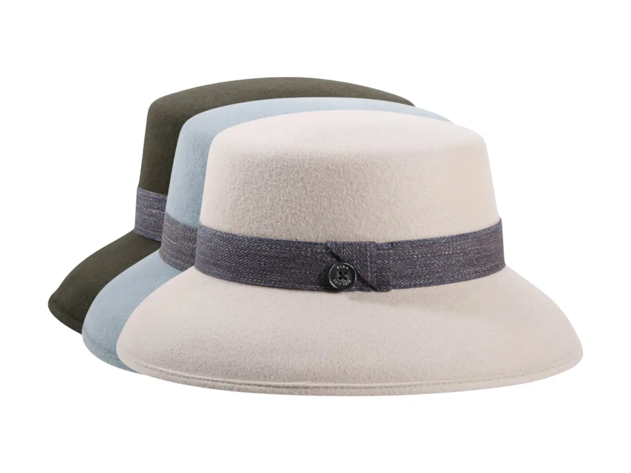 Das Highlight bildet das Hutband aus Denim-Baumwolle, geschmückt mit dem ikonischen „Risa seit 1919“ Qualitätsknopf – ein Symbol für Schweizer Handwerkskunst und Tradition. In den drei Farbvarianten Elfenbein, Himmelblau und Moos wird die Cloche zum vielseitigen Begleiter, der sowohl zu eleganten Mänteln als auch zu modernen Casual-Looks passt.