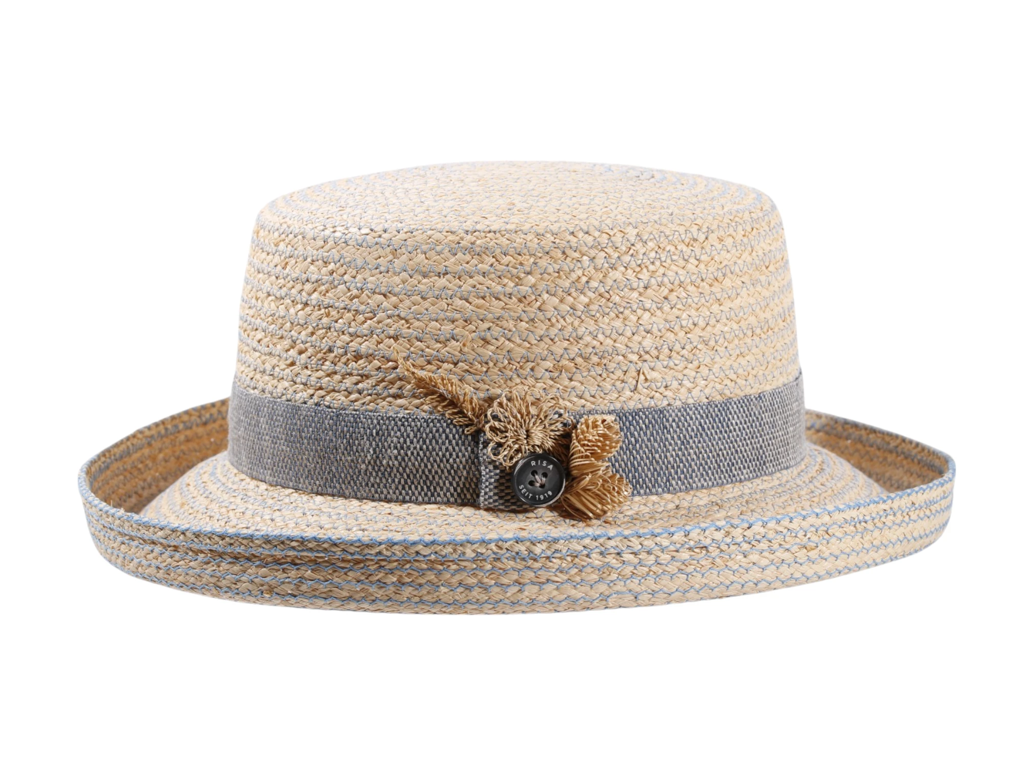 Ein besonderes Highlight ist das hochwertige Leinenband, das je nach Variante in hellblau/weiß oder natur/weiß erhältlich ist. Ergänzt durch kunstvolle Stroh-Agrements und den edlen Risa-Knopf, hebt sich dieses Modell durch seine feinen Details ab. Jeder Hut wird in der Schweizer Hutmanufaktur Risa individuell gefertigt und vereint höchste Handwerkskunst mit nachhaltigen Materialien.