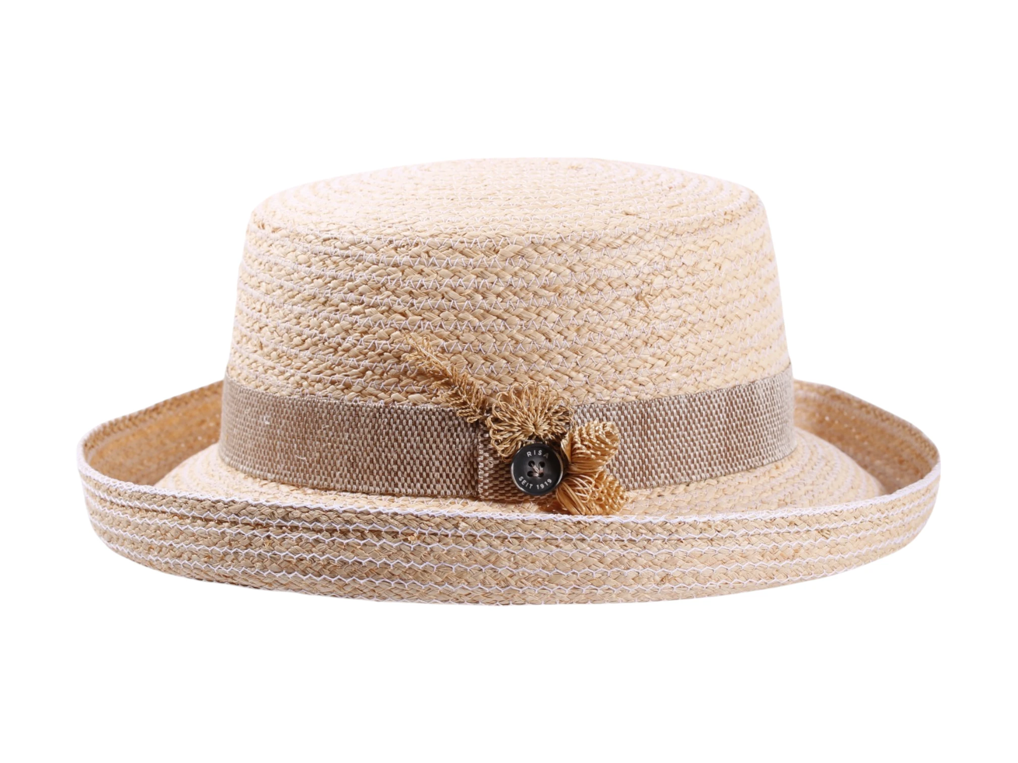 Mit seinem 6,5 cm breiten Rand, der stilvoll aufgeschlagen werden kann, bietet der Damen Aufschlaghut Raffia „Strohschmuck“ einen eleganten Sonnenschutz und eine charmante Silhouette. Die zylindrische Krone mit einer Höhe von 11 cm unterstreicht die klassische Form und sorgt für einen angenehmen Sitz.