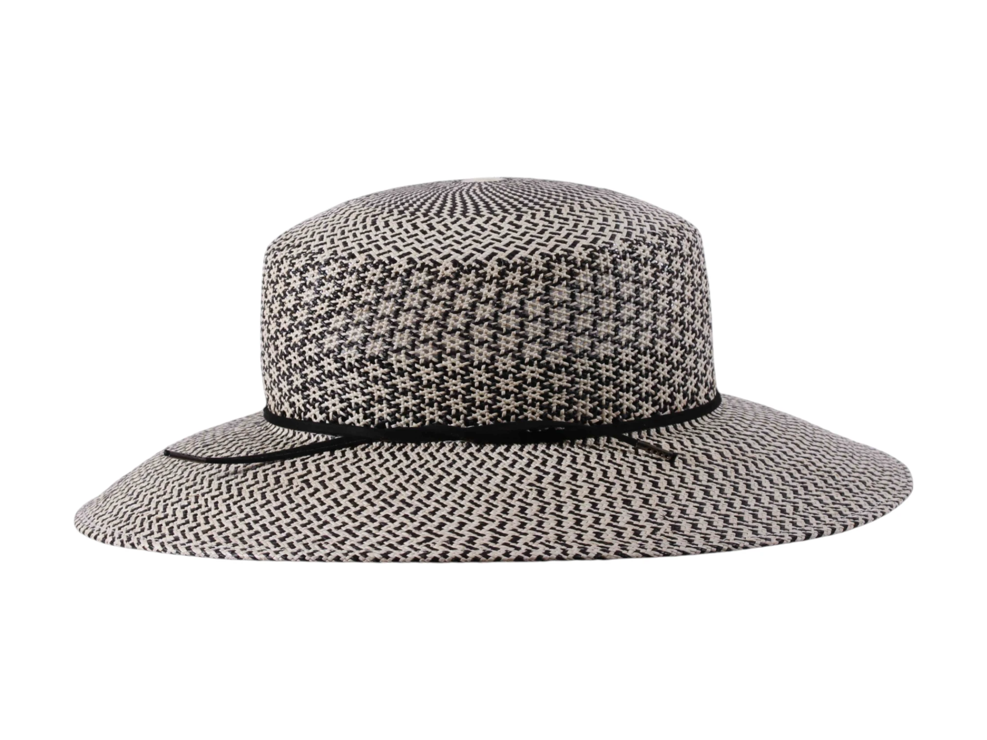 Die harmonisch flache Krone, kombiniert mit der großzügigen Krempe, schafft ein perfektes Gleichgewicht zwischen Schutz und Chic. Der monochrome Look in Weiß-Schwarz wirkt zeitlos und modisch zugleich – ein Lieblingsstück für Stilbewusste. Das schmale schwarze Rebsband mit feiner Schlaufe unterstreicht die dezente Eleganz dieses Modells und sorgt für einen stilvollen Akzent.
