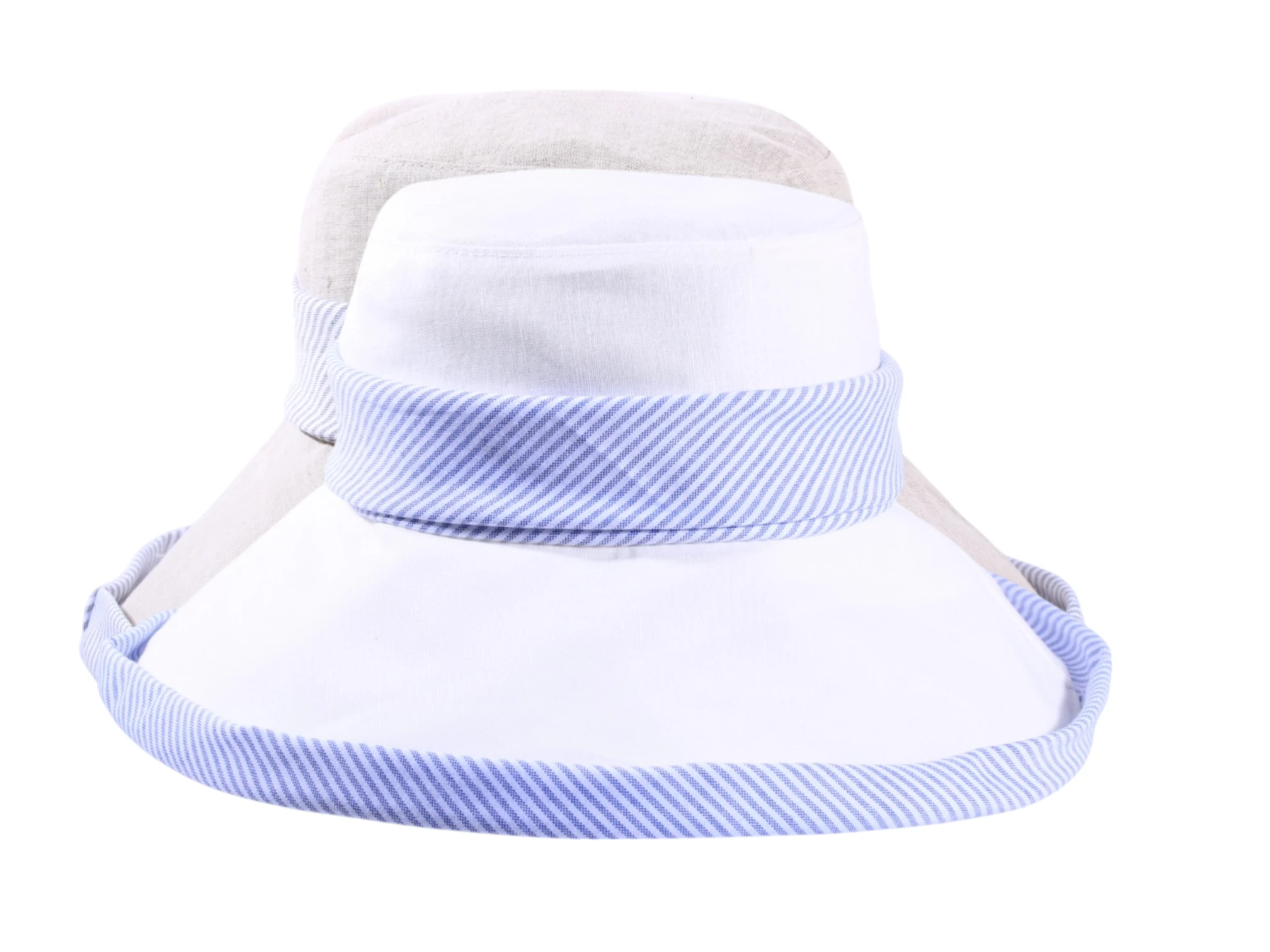 Die Kombination aus Leinen und Baumwolle sorgt für ein angenehmes, atmungsaktives Tragegefühl. Der Sommerhut Tiffany ist in zwei Farbvarianten erhältlich: Reinweiß für einen strahlend frischen Look und Hellbeige für eine dezente, natürliche Note. Das breite, gestreifte Leinenband in sanftem Blau verleiht diesem Modell einen maritimen Charme und macht es vielseitig kombinierbar.