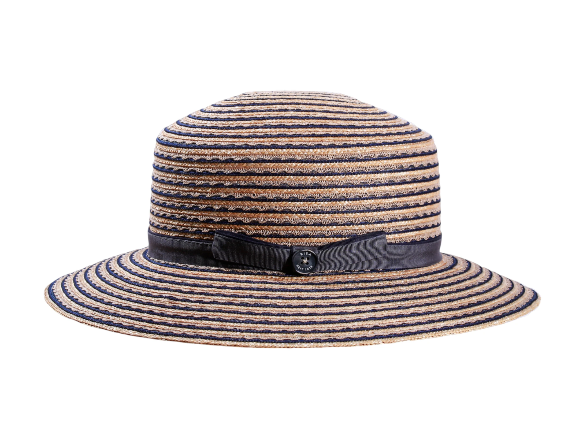 Damenhut Cloche gestreift in Marine/Natur mit Rebsband