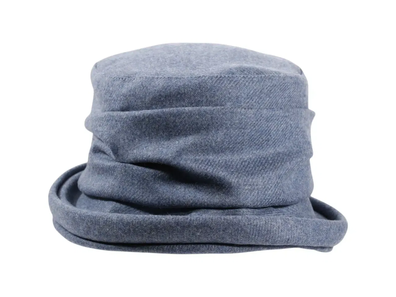Die leicht geraffte Form mit dekorativer Rollkante verleiht der Mütze eine feminine Note, während das feine Webmuster in der Farbe Jeansblau dezente Eleganz versprüht. Ein Accessoire, das Wärme spendet und zugleich als modisches Statement überzeugt.