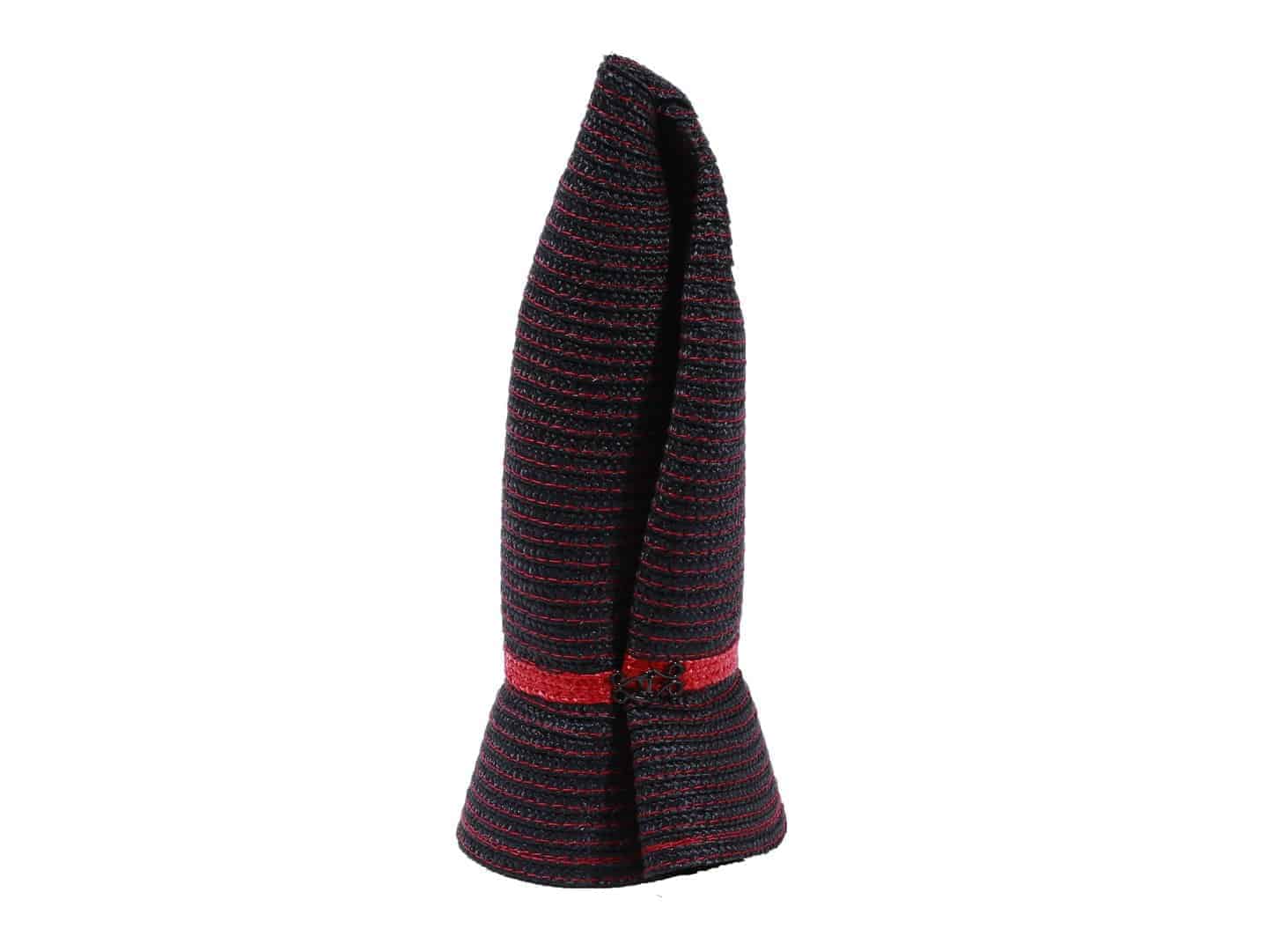 - 1. Schwarz mit Hutband in Rot, 2. Rot mit Hutband Schwarz, 3. Taupe mit Hutband Elfenbein, 4. Elfenbein mit Hutband Taupe, 5. Navy mit Hutband Taupe