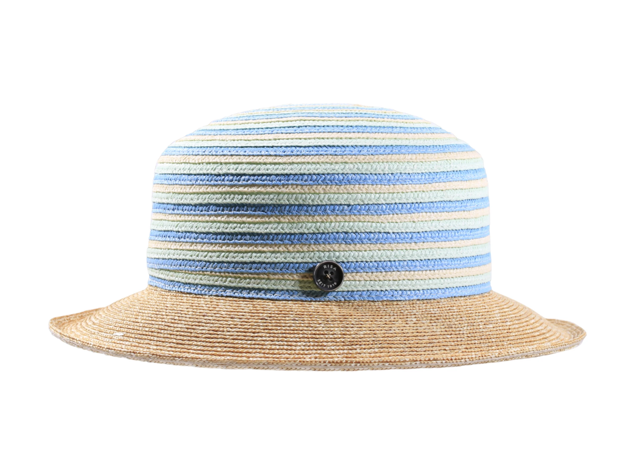 Das fein geflochtene Material aus 50 % Viskose und 50 % Weizenstroh sorgt für angenehme Leichtigkeit und gute Formstabilität. Der charmante Streifenmix in zarten Himmelblau- und Naturtönen verleiht dem Modell seinen unverwechselbaren Charakter. Der ikonische Risa seit 1919-Qualitätsknopf an der Seite rundet den Look edel und authentisch ab.