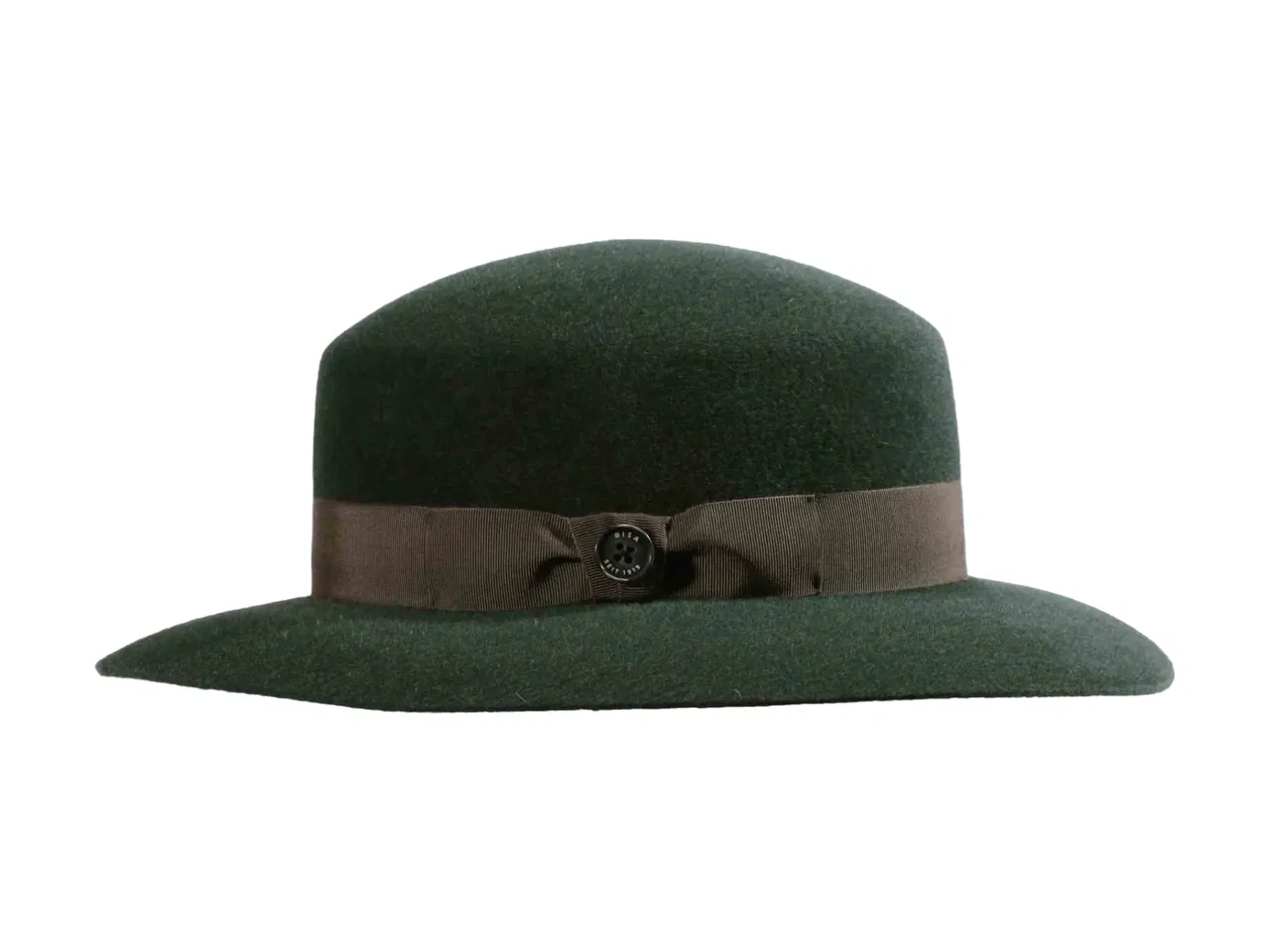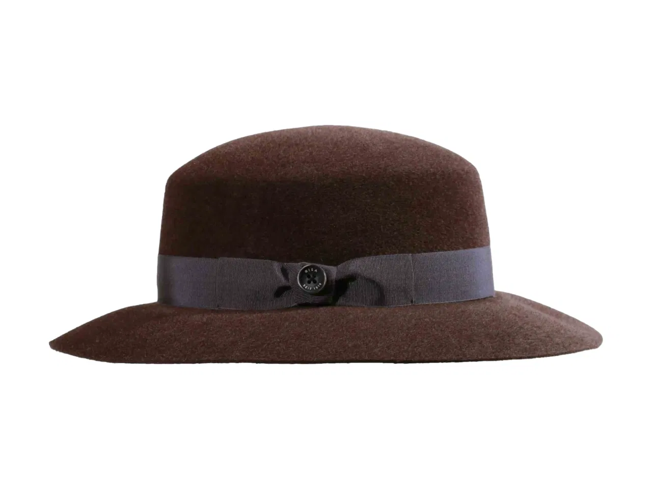 Die edle Garnitur besteht aus einem feinen Rebsband, das mit einer dekorativen Masche und dem „1919“-Knopf als Qualitätssiegel verziert ist. Der Hut ist mit einem sauber eingenähten Textilinnenband ausgestattet, das für zusätzlichen Tragekomfort sorgt. Hergestellt wird dieser Hut auf Bestellung in der traditionsreichen Schweizer Hutmanufaktur Risa, wo handwerkliche Präzision und Liebe zum Detail an erster Stelle stehen.