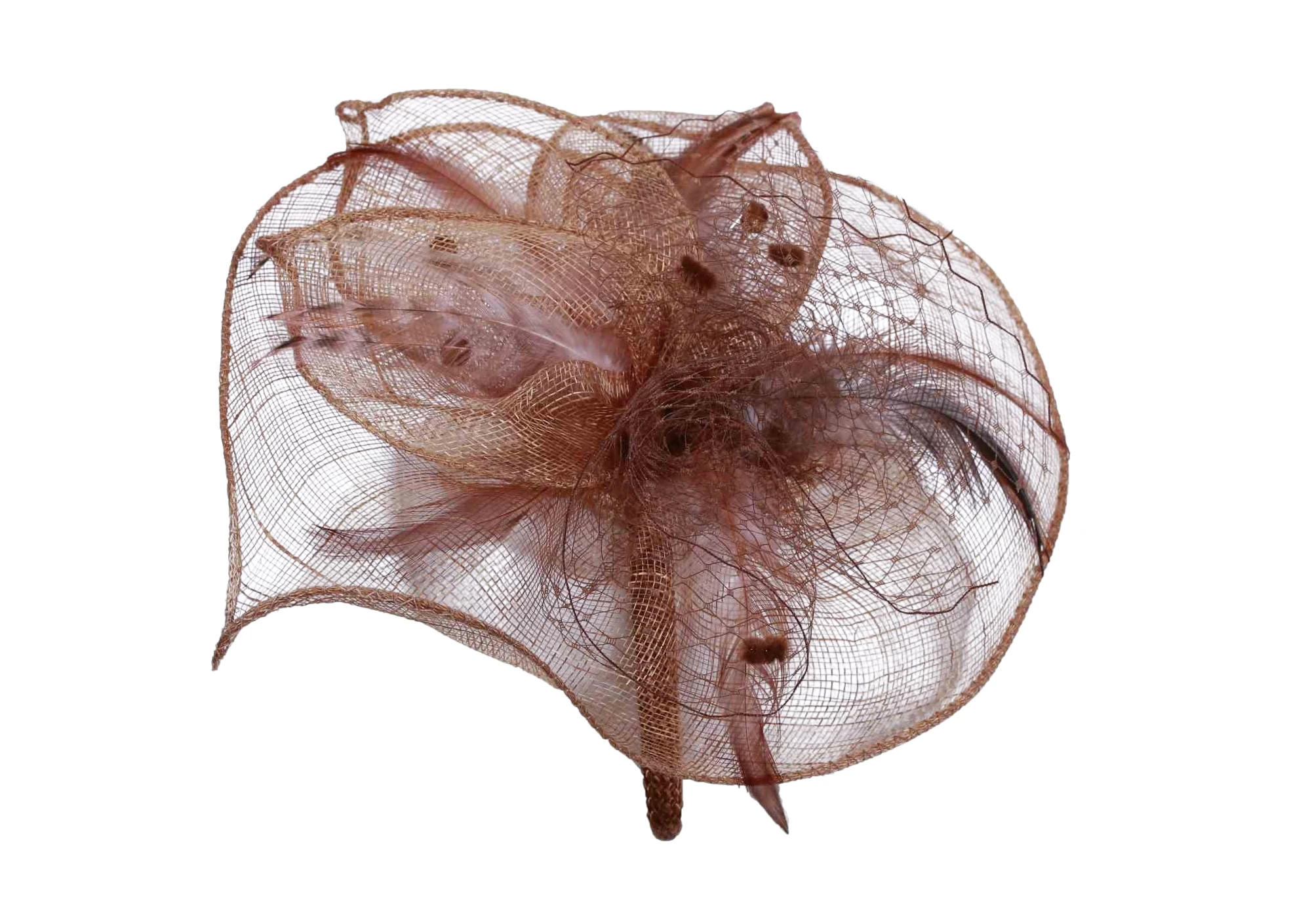Verleihen Sie Ihrem Look das gewisse Etwas! Dieser exquisite Fascinator aus 100% Sisal in edlem Camel-Ton ist der Inbegriff zeitloser Eleganz und femininer Raffinesse. Zarte Federn und kunstvolle Blütenarrangements verleihen ihm eine luftige Leichtigkeit, während die asymmetrische Form für einen aufregenden Hingucker sorgt. Perfekt für besondere Anlässe oder als modisches Statement.