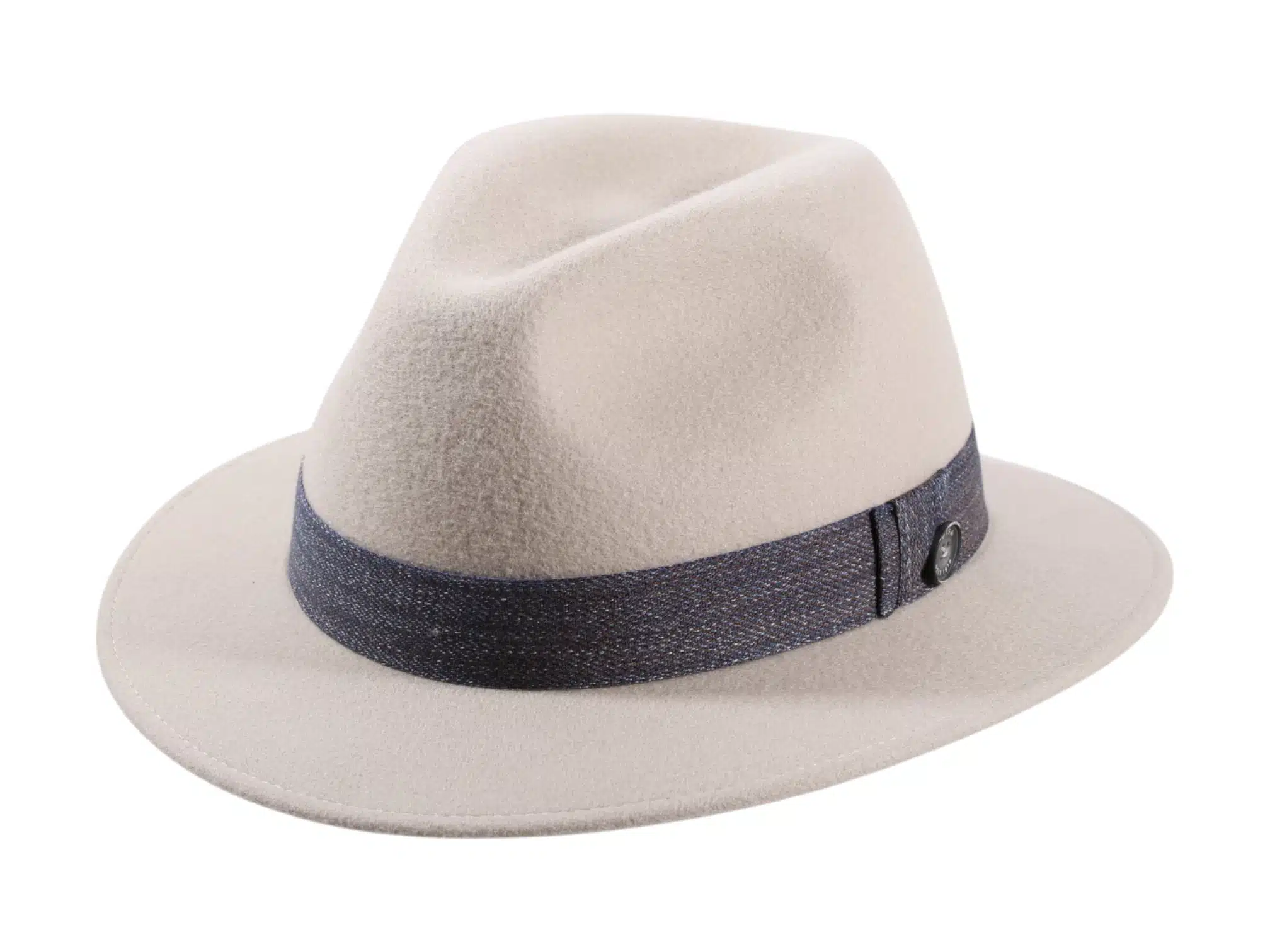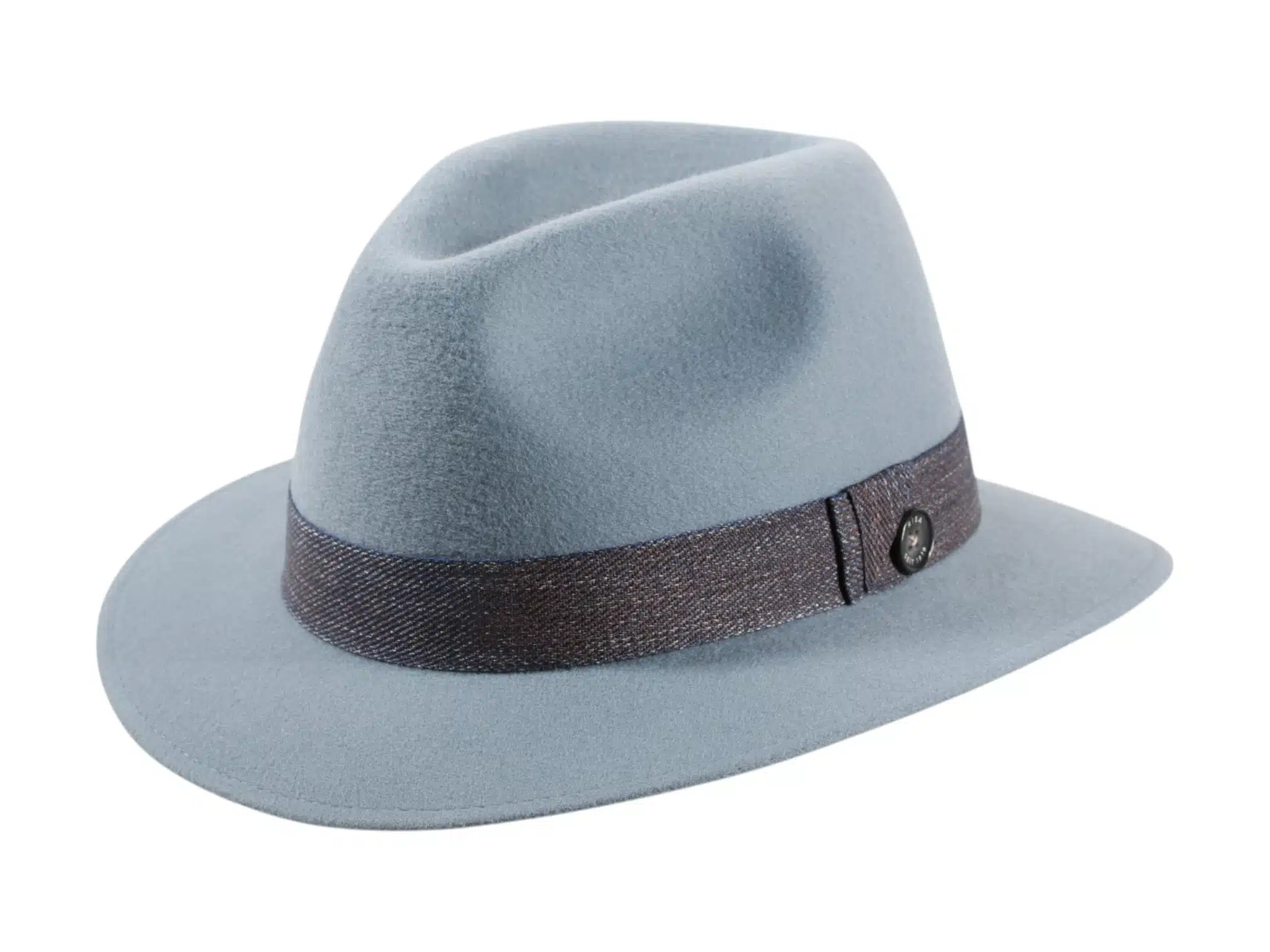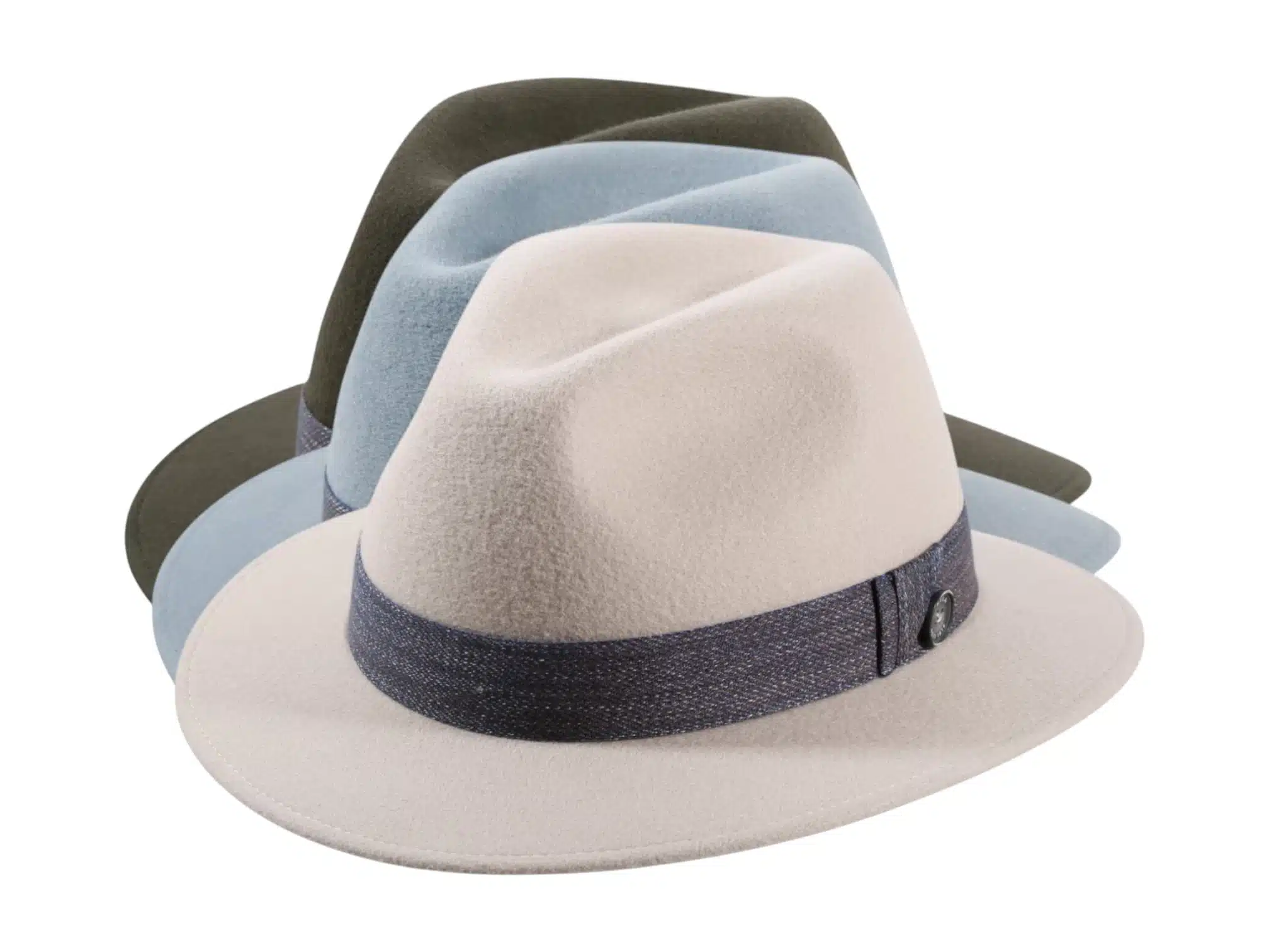 Welche Besonderheit hat der „Teo Cotone“? Das Denim-Hutband mit Traverse macht ihn zum modernen Fedora mit sportlichem Akzent.