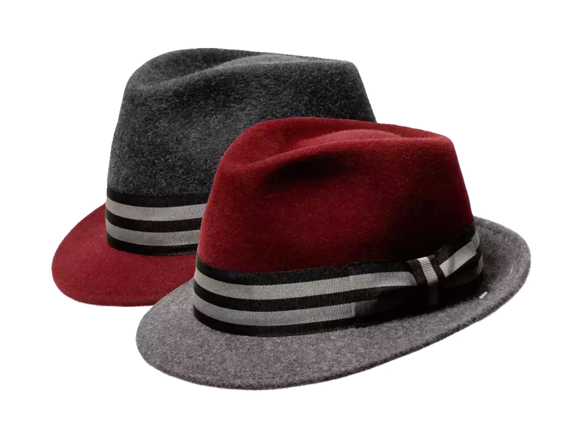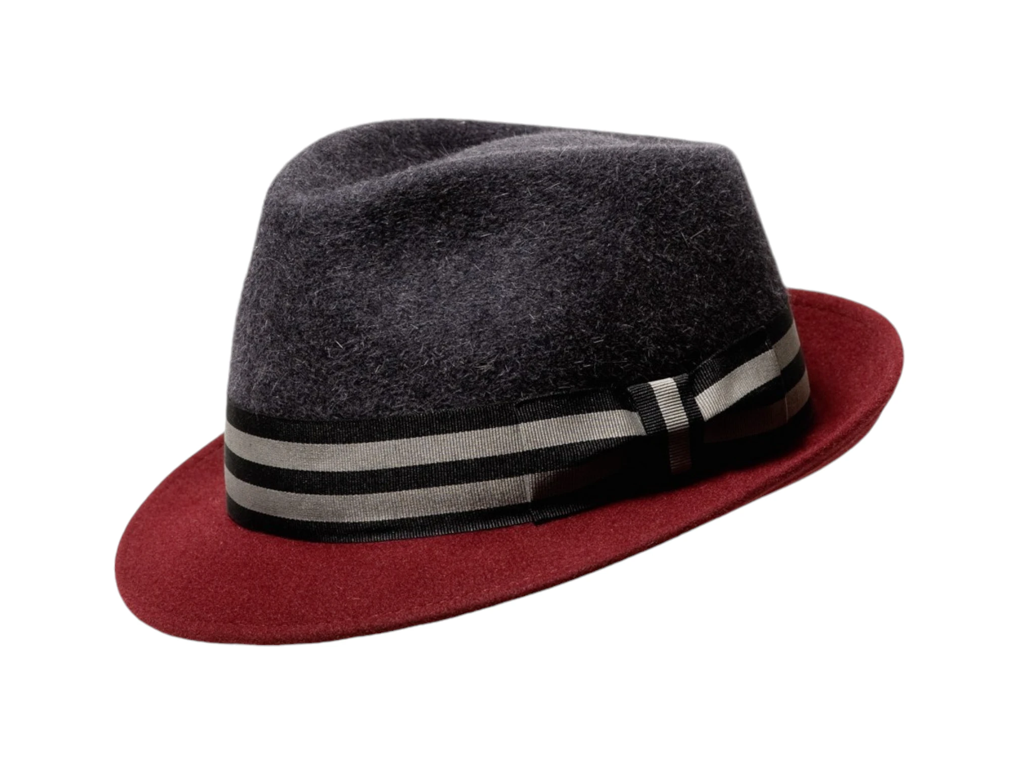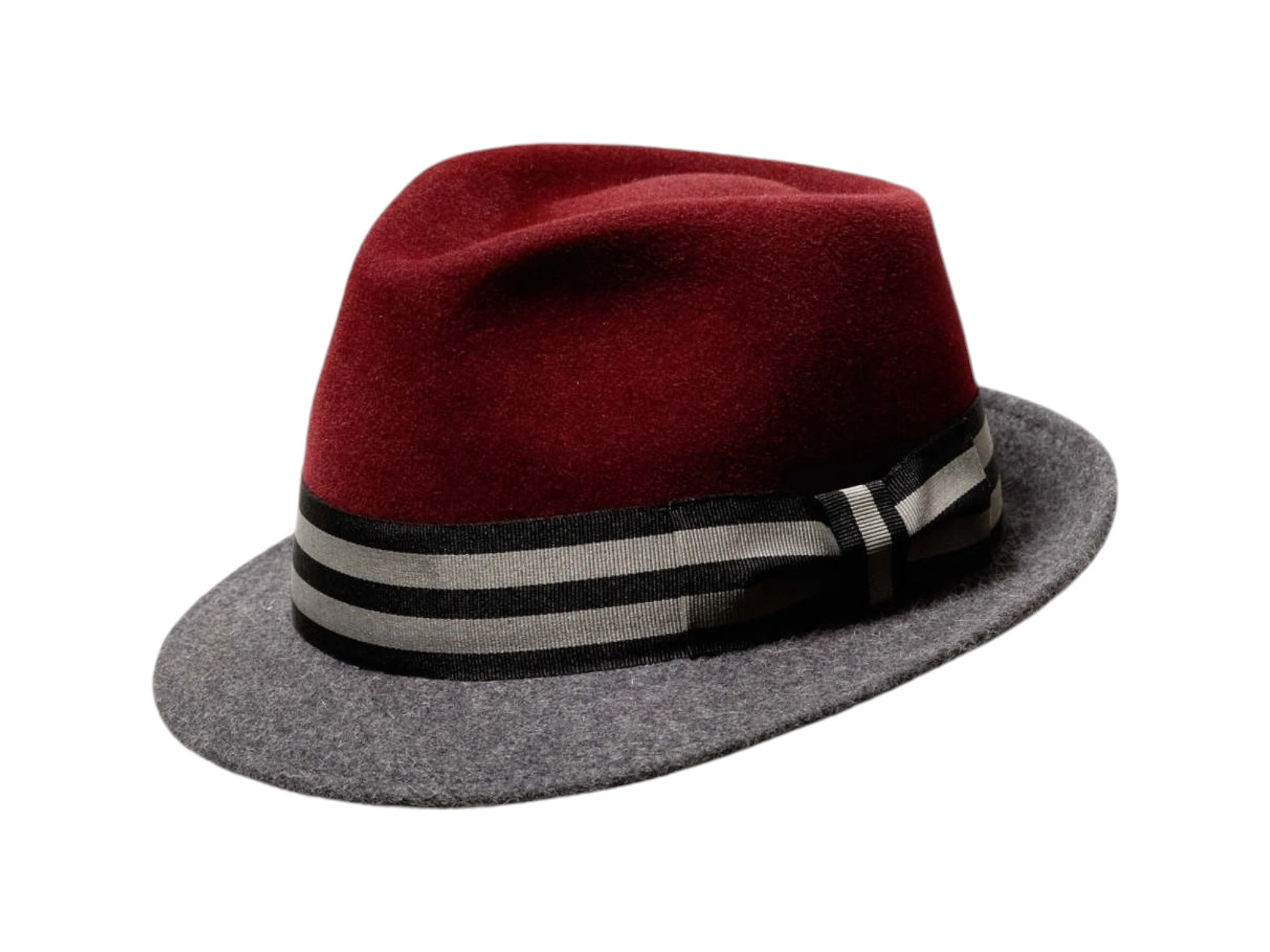 Der Trilby 2 Pieces spielt mit den Kontrasten: Jede Variante des Hutes kombiniert zwei harmonische Farbtöne – wie Bordeaux mit Grau oder Blau mit Bordeaux – und verleiht jedem Outfit das gewisse Etwas. Mit einer Randbreite von 5 cm und einer Kopfhöhe von 10,5 cm bietet dieser Hut den perfekten Mix aus klassischem Stil und modernem Design. Die Garnitur aus gestreiftem Rebsband mit einer stilvollen Masche rundet das elegante Erscheinungsbild ab.