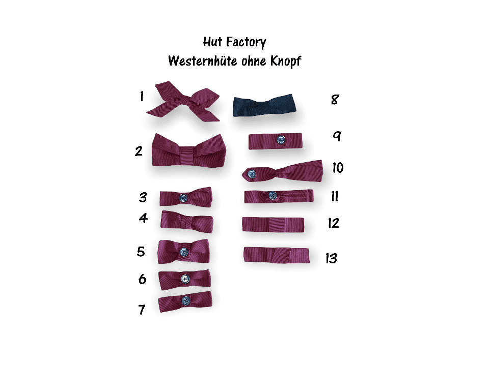 Standardgemäss wird der Westernhut mit Stoffhutband und einer Masche oder Traverse aus feinstem Rebsband gemäss dem Produktfoto ausgestattet. Als Option stehen Ihnen weitere 13 Maschen Typen zur Auswahl: