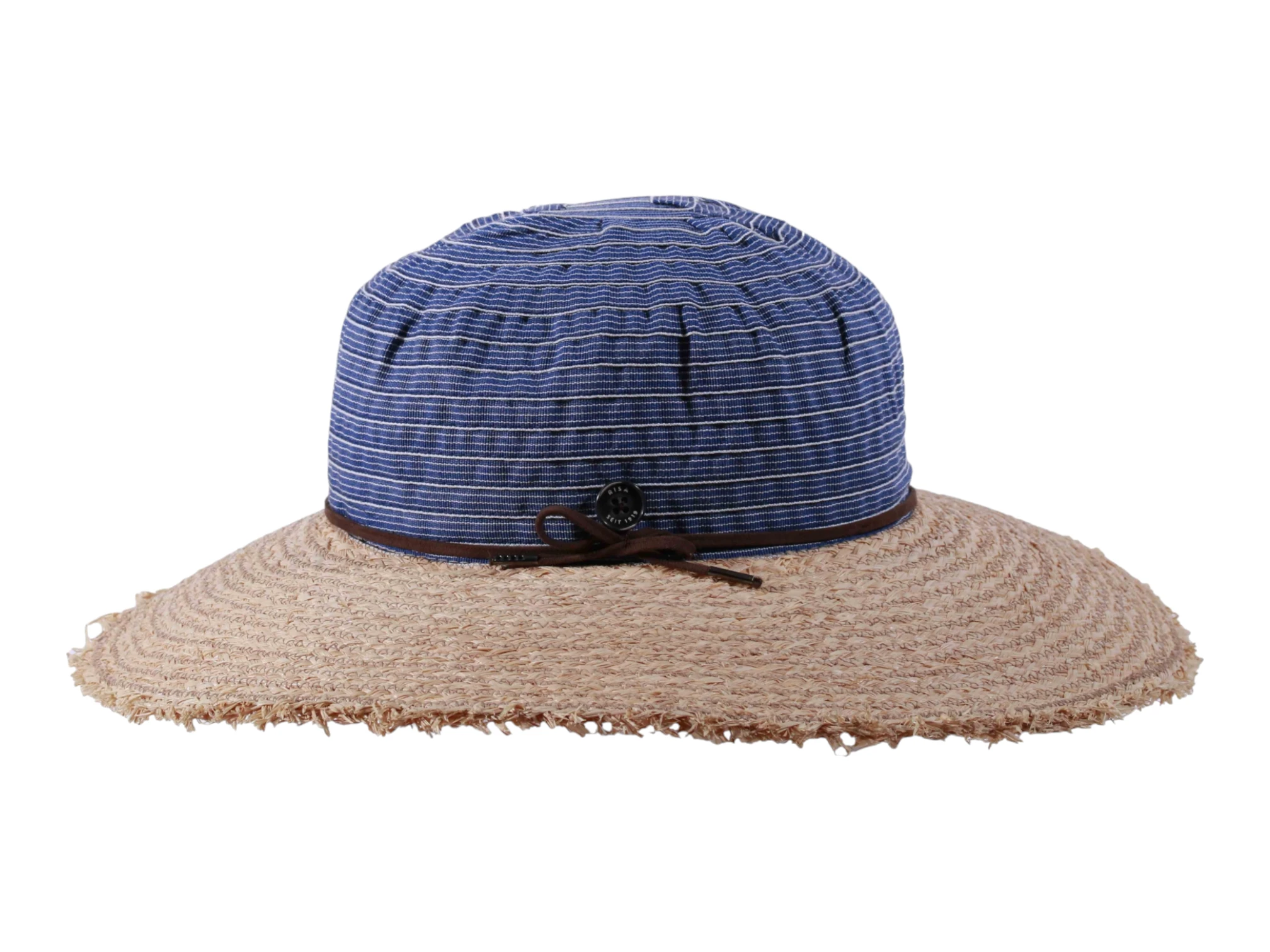 Dieser elegante Kofferhut Cloche mit breitem Rand ist die perfekte Wahl für stilbewusste Sonnenanbeterinnen. Die Kopfform im Cloche-Stil wirkt charmant nostalgisch und wird durch einen flachen, extrabreiten Rand kontrastiert, der nicht nur modisch überzeugt, sondern gleichzeitig optimalen Schutz bietet. Das fein strukturierte, naturfarbene Raffiamaterial wird durch ein dunkelblaues, gestreiftes Stoffoberteil ergänzt – ein spannender Materialmix, der Leichtigkeit und sommerliche Frische vermittelt. Besonders clever: Der Hut ist faltbar, lässt sich flach zusammendrücken und mühelos im Koffer oder in der Strandtasche verstauen.