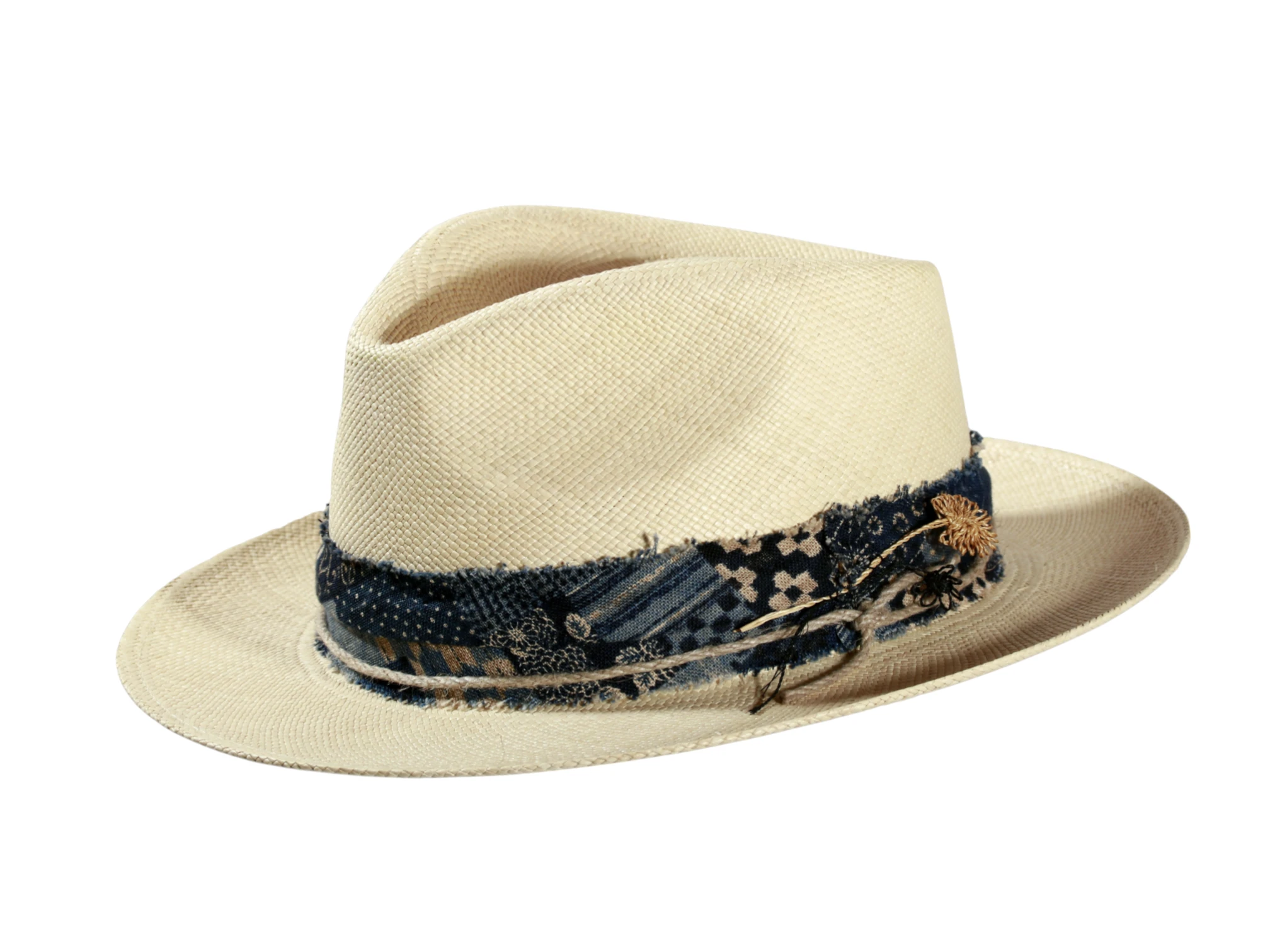 Das Modell überzeugt durch seine fein strukturierte Form mit klassischem Fedora-Schnitt, mittelhoher Krone (ca. 10 cm) und harmonisch geschwungener 6 cm breiter Krempe. Die zwei Farbvarianten – Natur und ein intensives Dunkelbraun – bilden die perfekte Leinwand für die extravagante Garnitur: ein raffiniertes Hutband aus japanischem Leinenstoff, liebevoll veredelt mit rustikaler Schnur und einer Zierblume aus naturbelassenem Weizenstroh. Jeder Panamahut wird in liebevoller Handarbeit gefertigt – und ist so individuell wie sein Träger.
