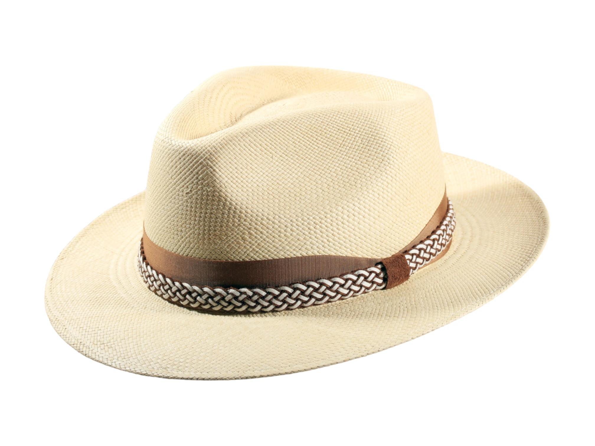 Der Fedora Leather-Braid vereint formschöne Eleganz mit rustikalem Detailreichtum. Die feine Flechtung des Panamastrohs kontrastiert harmonisch mit der strukturierten Garnitur. Die in Europa gefertigte Hutform überzeugt durch ihre klare Linie, präzise Verarbeitung und zeitlose Ausstrahlung – ein Accessoire mit Charakter.