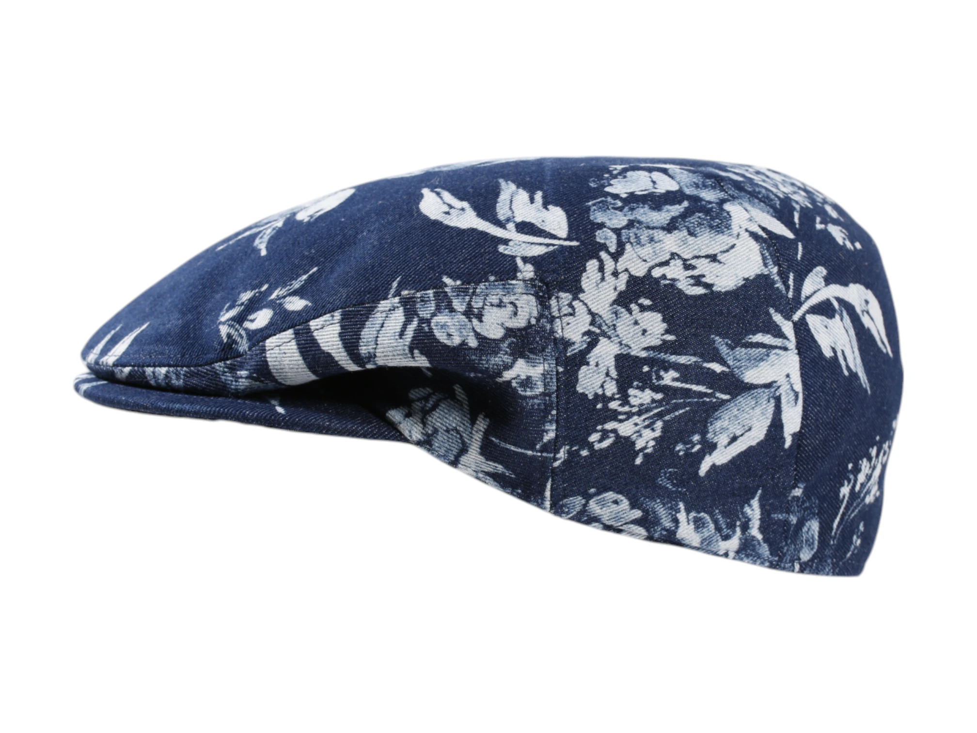 Die florale Schiebermütze vereint klassische Elemente mit modernem Flair. Der geschwungene Schnitt mit leicht verlängertem Schild sorgt für eine schmeichelhafte Passform. Das detailreiche Muster auf jeansblauem Baumwollstoff macht die Mütze zu einem wahren Hingucker für trendbewusste Träger.