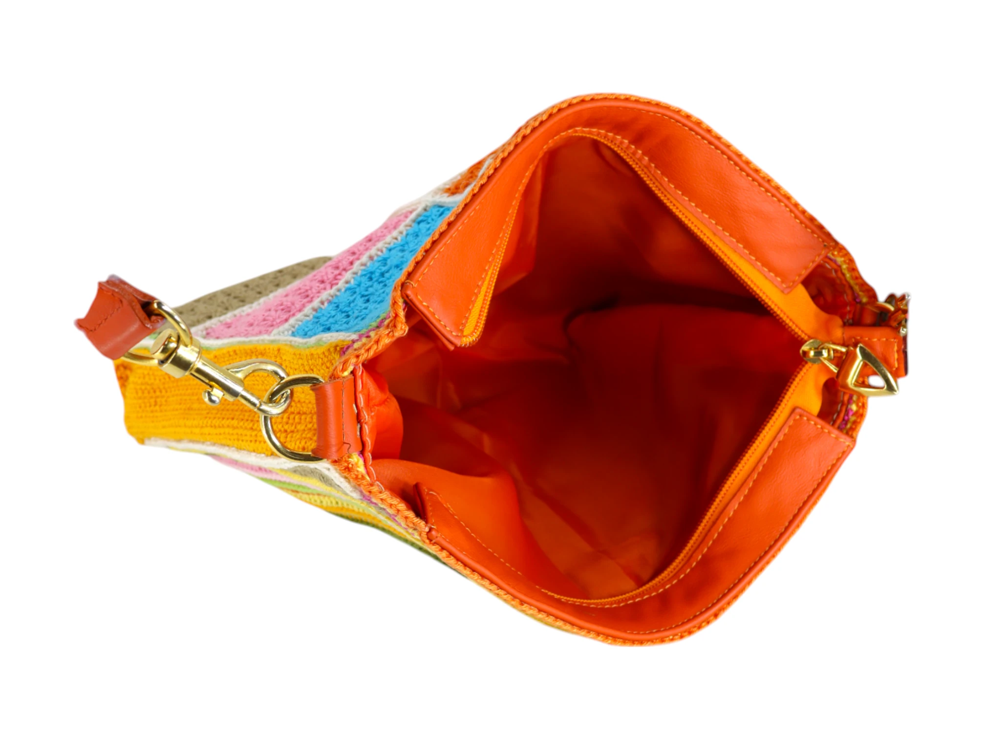 Multicolor Schultertasche mit Garnwolle-Patchwork und Lederdetails, ideal für modebewusste Frauen, die Qualität und Design schätzen.