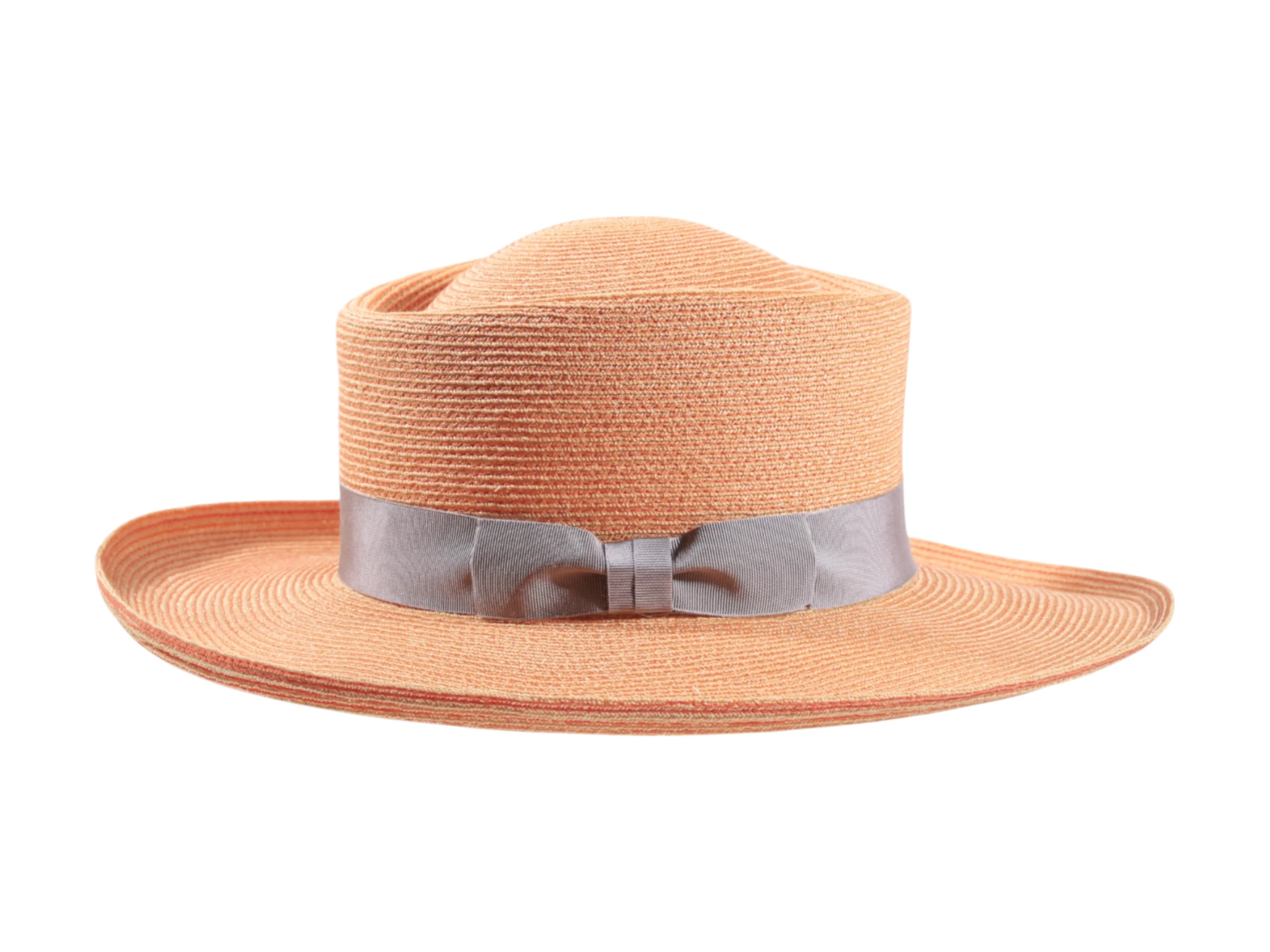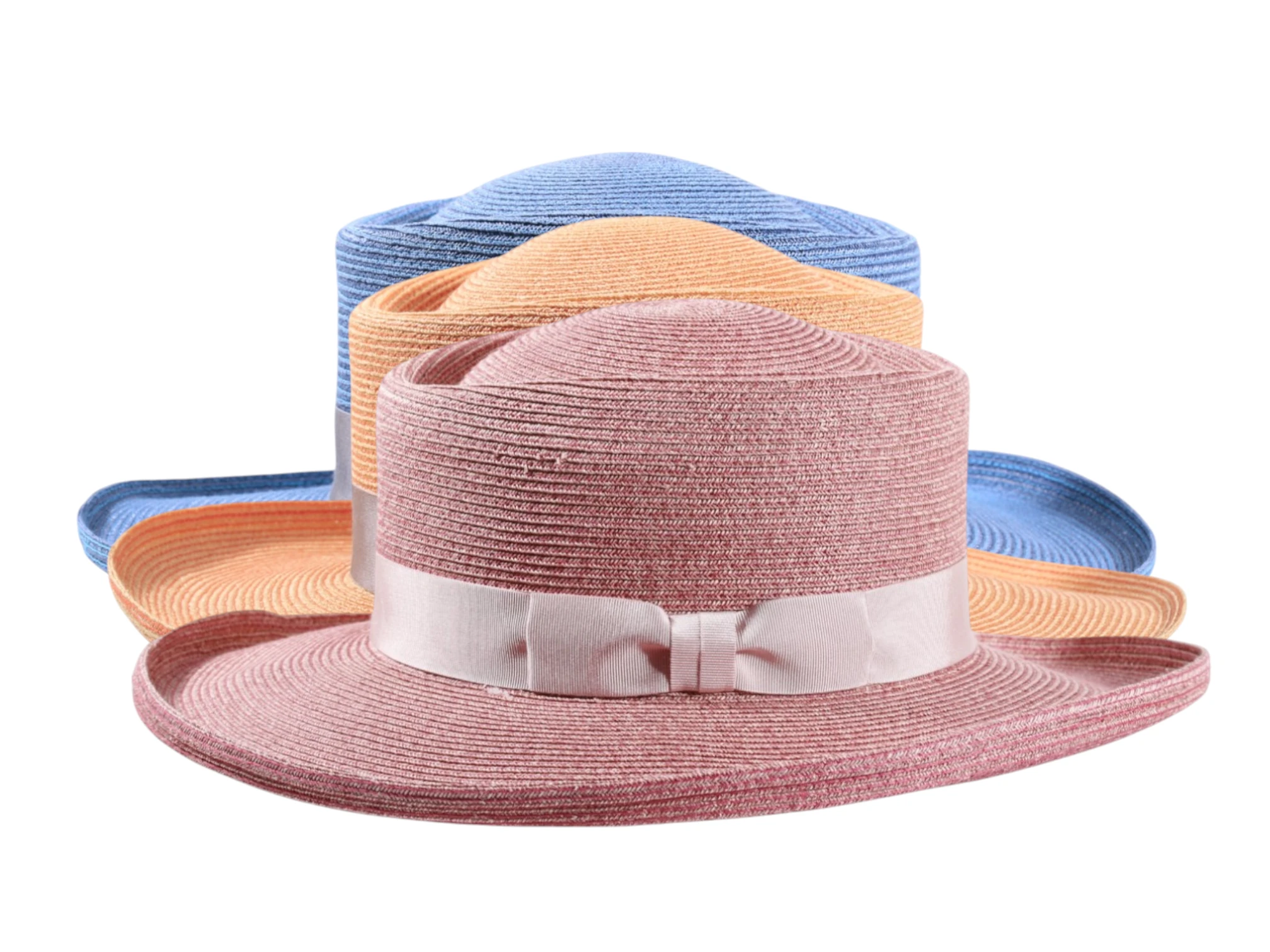 Breitrandiger Sommerhut aus 100 % Hanf in Apricot, Pink und Ciel mit elegantem Rebsband