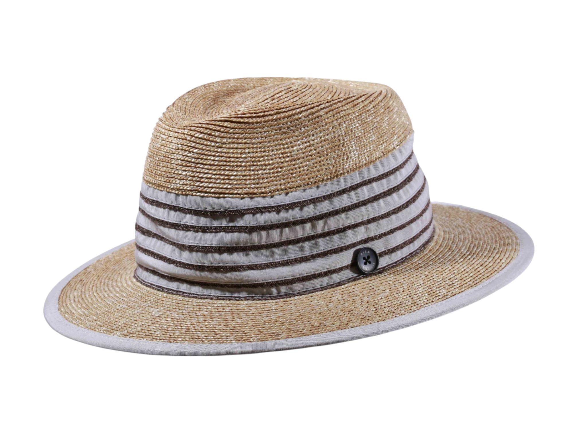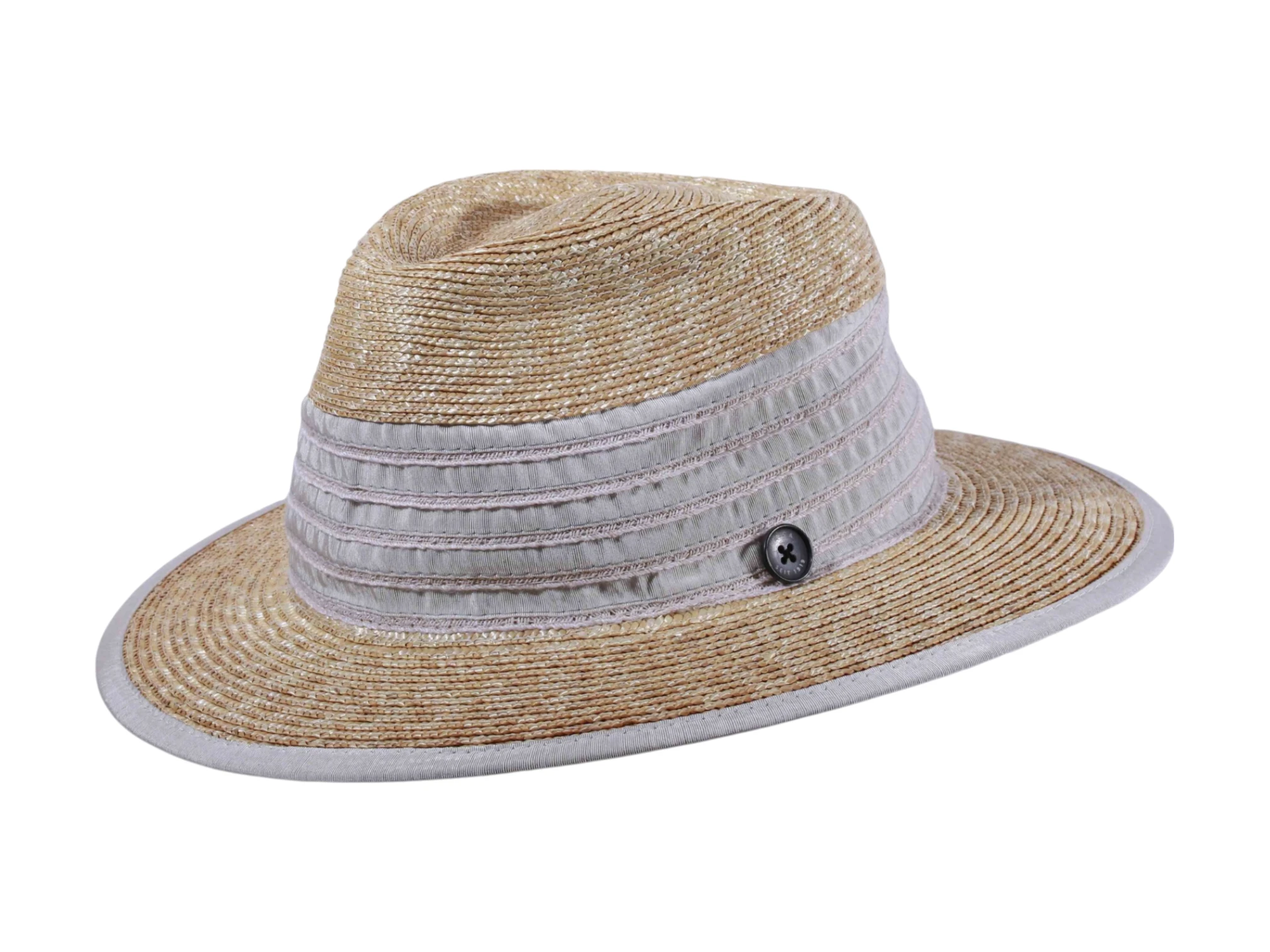 Die charakteristische Fedora-Form mit ihrer eleganten Krone und der umlaufenden, breiten Krempe sorgt für einen stilvollen Auftritt und besten Sonnenschutz. Die zarte Struktur aus Naturstroh und Leinen verleiht dem Hut eine feine Textur, während die plissierte Leinen-Garnitur in hellen Naturtönen für Raffinesse sorgt. Ein seitlich angebrachter, schwarzer Qualitätsknopf mit „Risa seit 1919“ rundet das Design mit einem subtilen, ikonischen Detail ab.