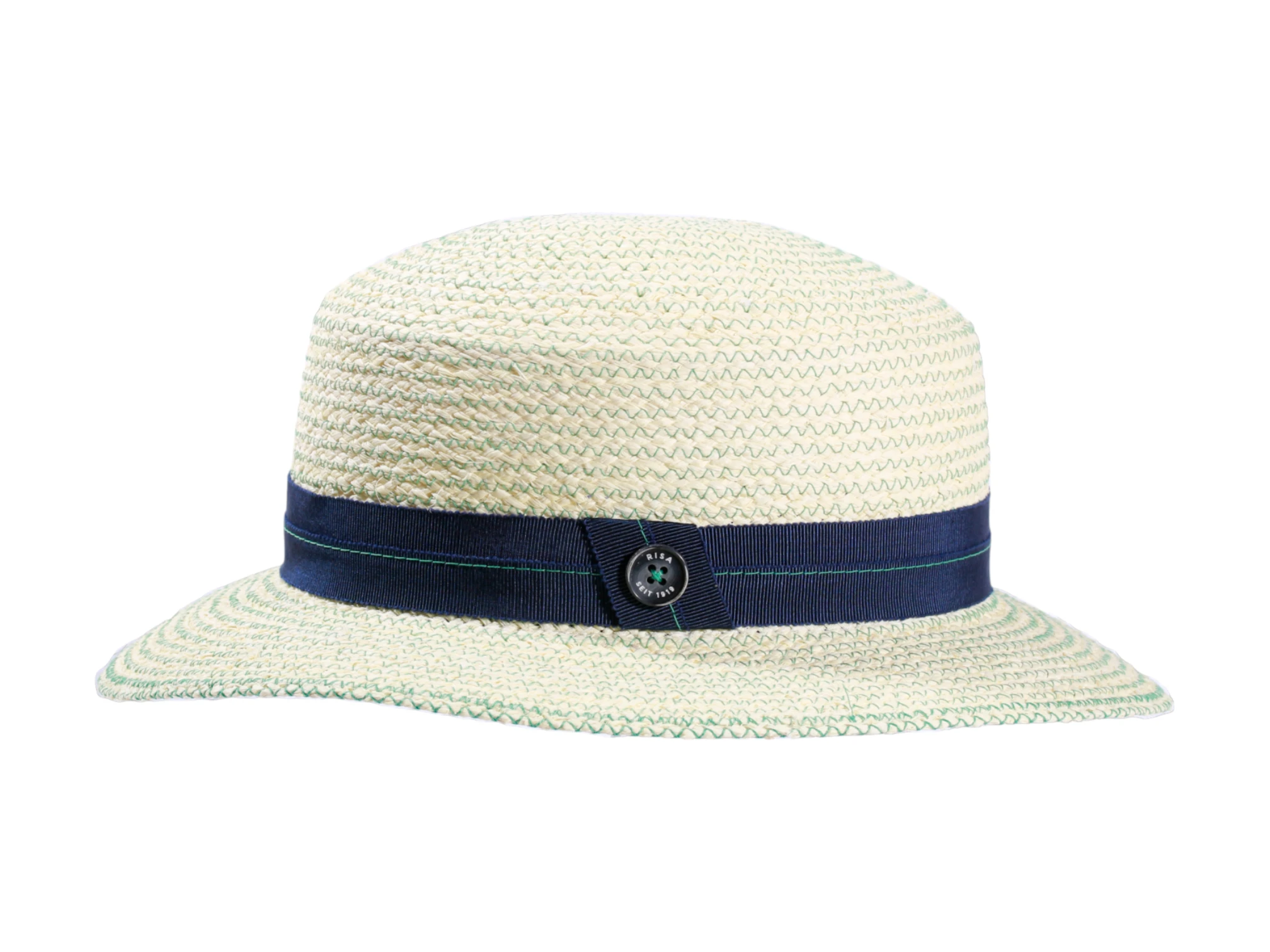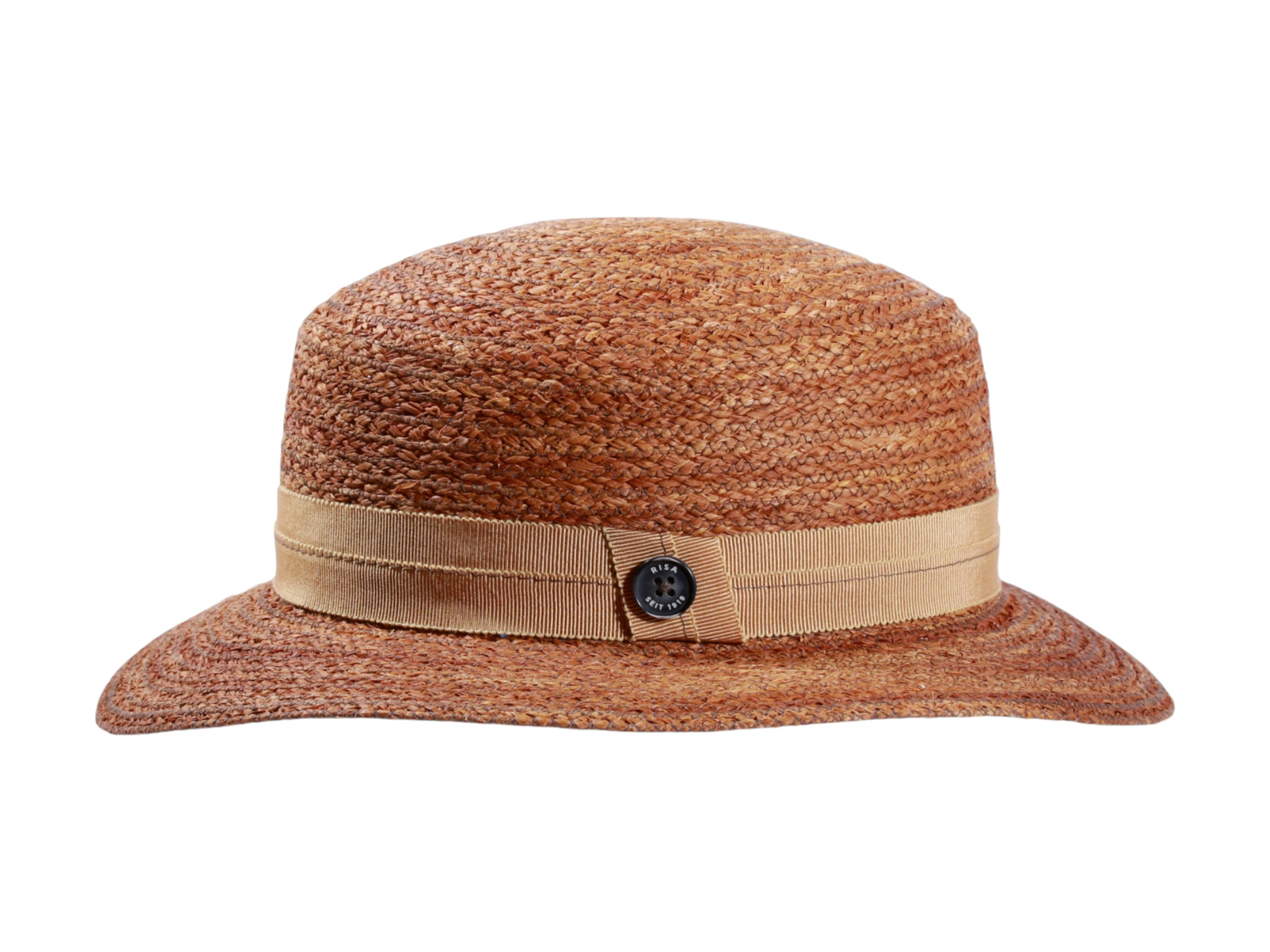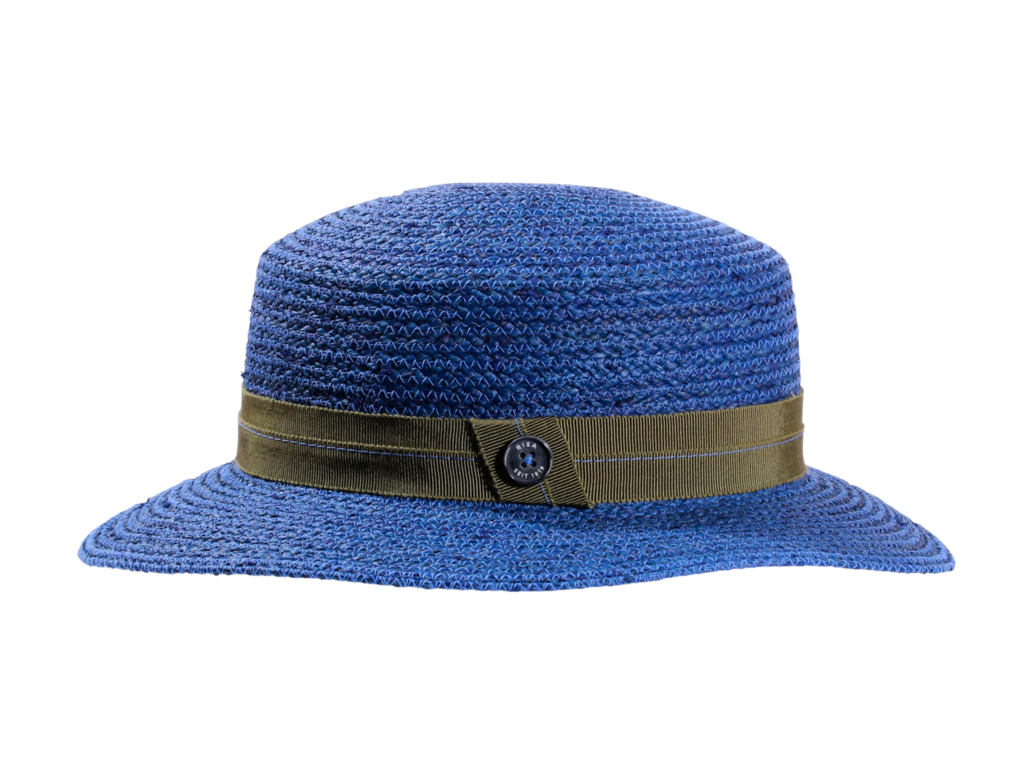 Ob in warmem Nougat mit senffarbener Garnitur, in leuchtendem Jeansblau mit Olive oder in zartem Weiß mit kühlem Marine – jede Variante bringt sommerliche Frische in Ihre Garderobe. Der 1919 Qualitätsknopf an der Seite unterstreicht die handwerkliche Signatur der Risa Hutmanufaktur.