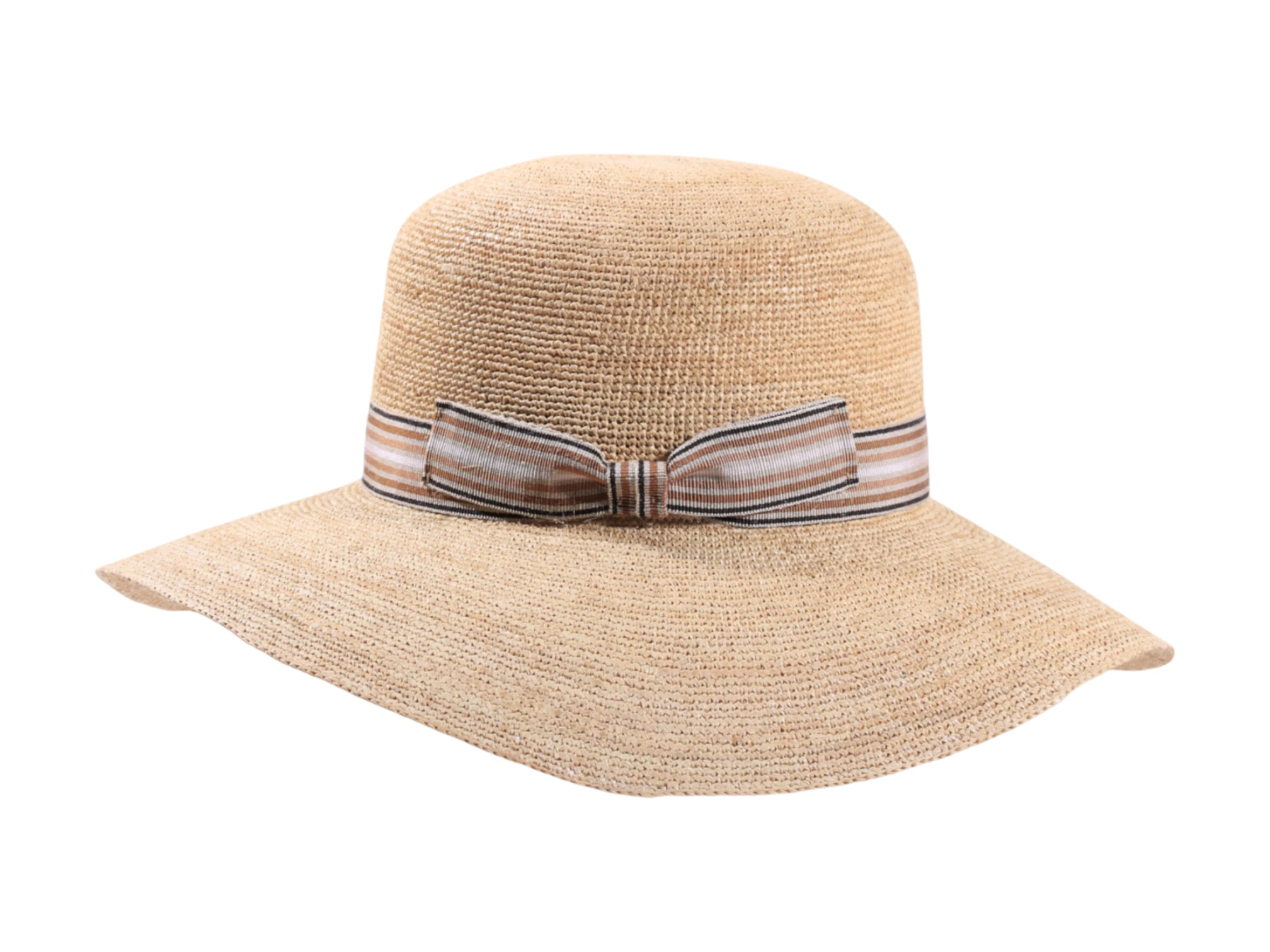 Das markante gestreifte Leinenhutband mit dekorativer Schleife verleiht dem Modell eine charmante Note und hebt die edle Handarbeit zusätzlich hervor. Die breite Krempe bietet angenehmen Sonnenschutz und unterstreicht den femininen Stil dieses zeitlosen Sommerhuts.