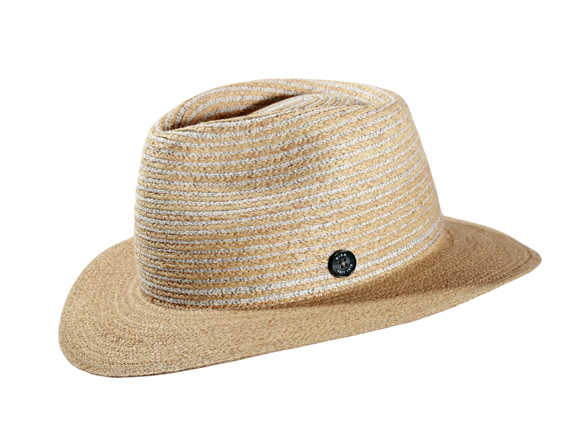 Material: 80% Raffia / 20% Leinen – natürlich, luftig und sommerlich angenehm Randbreite: 6.0 cm – dezente Krempe mit gutem Sonnenschutz Kopfhöhe: 10.5 cm – klassische Fedora-Silhouette mit klarer Linienführung Farbe: Natur/Weiss – gestreifte Flechtoptik mit organischem Charakter Garnitur: Risa seit 1919 Qualitätsknopf seitlich platziert Schweißband: Textilinnenband – sauber verarbeitet für besten Tragekomfort Größen: 54–64