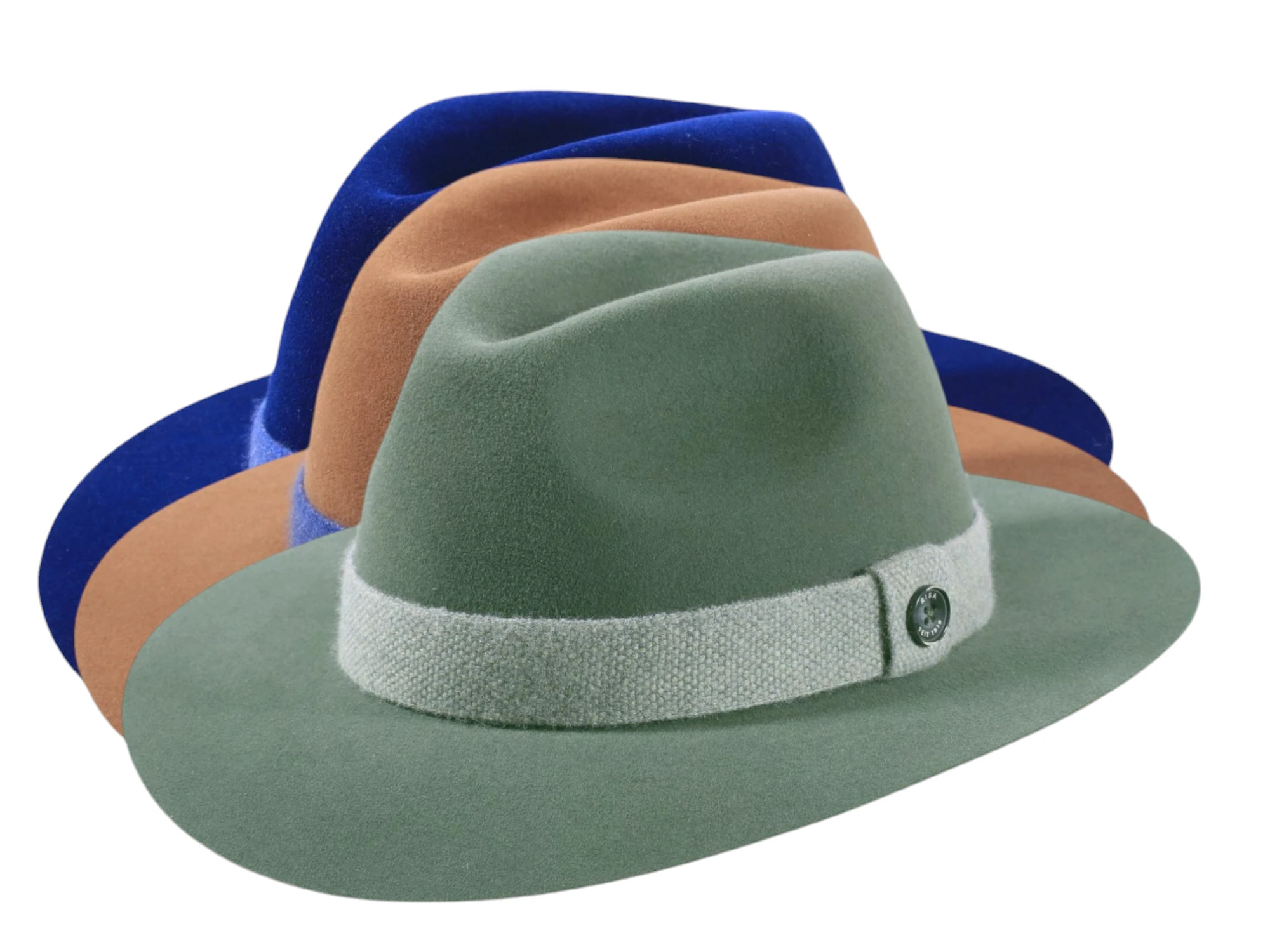 Die Farbkombinationen – Camel mit Jeansblau, Leucht-Marine mit Jeansblau oder Kaperngrün mit Salbei – verleihen dem Hut eine zeitgemäße Note. Das Wollband mit ikonischem „Risa seit 1919“-Knopf rundet das Design als unverkennbares Qualitätsmerkmal ab.