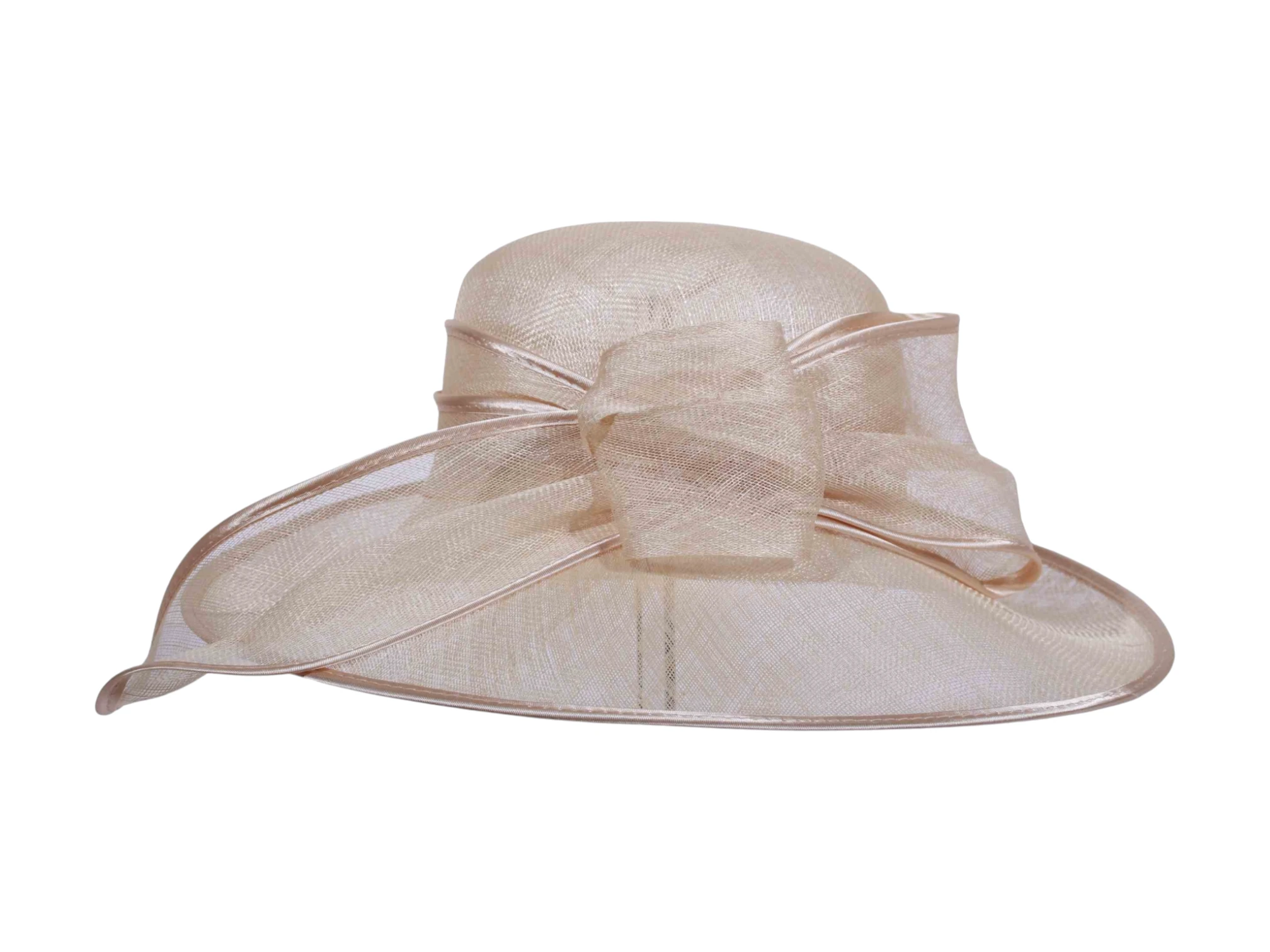 Lassen Sie sich von der luftigen Anmut dieses breitrandigen Anlasshutes verzaubern! Gefertigt aus hochwertigem Sisal, besticht dieser Hut durch seine feine Transparenz, die nicht nur visuell beeindruckt, sondern auch für ein angenehm leichtes Tragegefühl sorgt. Die kunstvoll geformte Sisal-Schlaufe verleiht dem Design eine subtile Verspieltheit und sorgt für einen edlen, femininen Look.