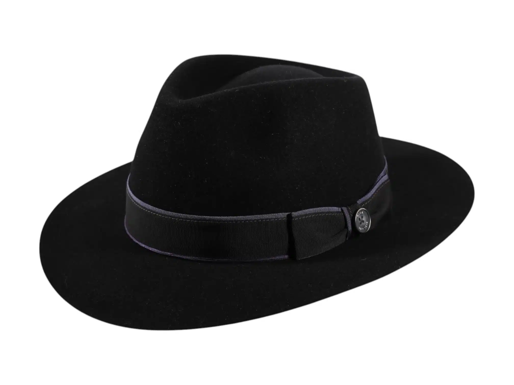 Luxuriöser Fedora Traveler aus 100% Haarfilz mit 6.5 cm breiter Krempe. Edle Garnitur mit Rebsband, Paspel und ikonischem Risa-Knopf. Handgefertigt in der Schweiz.